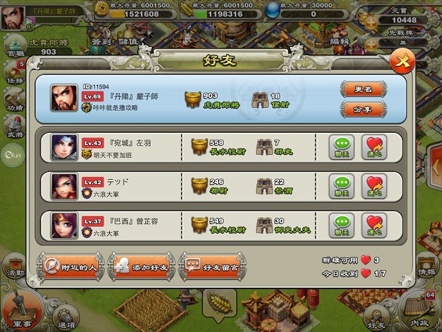 名將爭霸》好友系統的一大特色,玩家盡可以在遊戲中與好友一較高下!好友間的切磋是烈火戰鬥中的最佳演練場,玩家可以通過與好友的切磋來了解自己陣型的薄弱之處、尋找突破對方陣型的方案,為攻打城池做準備!不過既然是“好友切磋”,這裡不能掠奪好友的資源,也不會損耗兵力。趕快約上好友切磋一番!