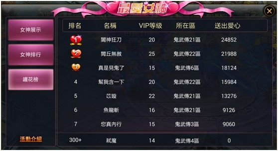 玩家在遊戲內點擊「最愛女神」活動按鈕,即可為自己心愛的女神送愛心!愛心可以透過遊戲內的副本、第四章關卡打怪獲得,也可以進行儲值直接獲取。