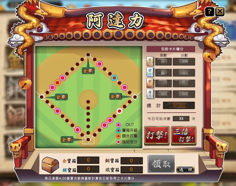 玩家最愛的阿達力系統滿壘金寶箱來囉!只要踩上壘包不出局,金寶箱讓你拿翻天!週六凌晨4點更新,讓你碰碰運氣搶攻阿達力!