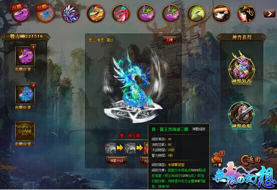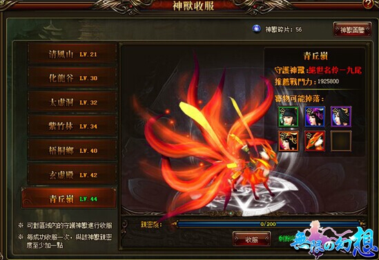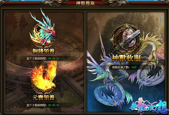 神獸收復,每個區域都有一隻頂級品質的紅色神獸守護,每成功收復一次可隨機獲得某品質神獸、神獸符、靈氣等。靈氣可用於神獸技能升級,同時與該神獸的親密度至少增加 1 點,當親密度達至滿時,100% 可獲得該頂級品質紅色神獸。