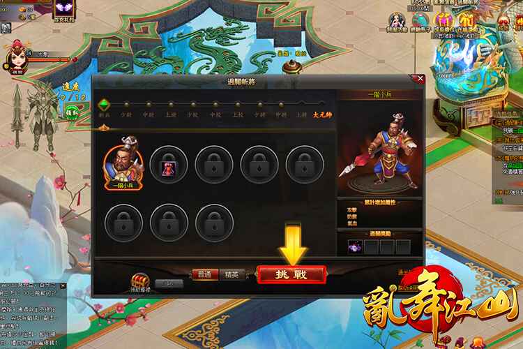 英雄豪傑日日精進武藝,怎麼能屈就一般雜兵之名呢?想得到象徵豐功偉業的「軍銜」,就必須付出努力,勇敢挑戰眼前的各階將領吧!「過關斬將」系統分為少尉、中尉、上尉等系列,各十道關卡,玩家必須取得勝利才可進行下一關喔!