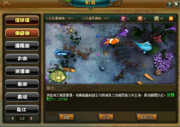 玩家通過建立的漁業分城中的「船塢」進入活動介面,選擇出海地圖後進入相應海域即可開始捕魚,海量武將經驗全藏匿在各類深海魚種中。