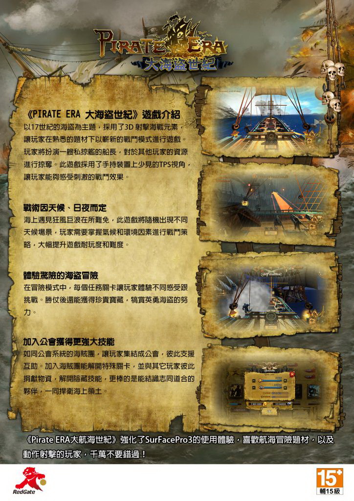 台灣微軟今日正式在台推出強調機身輕薄兼具效能的 Surface Pro 3,遊戲橘子旗下研發子公司紅門數位同步配合 Sufface Pro 3 上市,優先在微軟市集推出自製研發海戰新作《大海盜世紀(Pirate ERA)》,遊戲強調容易上手,但又不會因此簡化玩家炮擊與作戰的樂趣,除了 PC 版本正式上市外,未來一個月內也計畫推出 iOS 與 Android 版本。