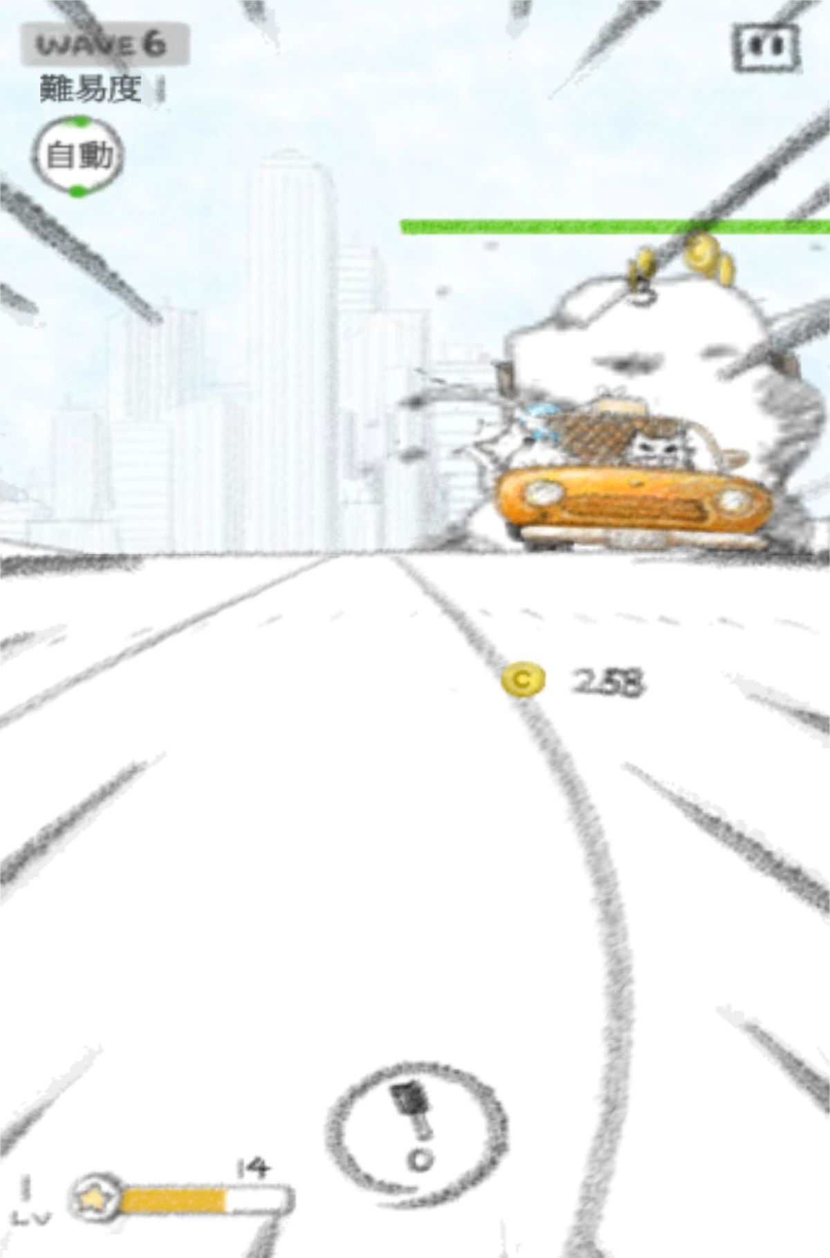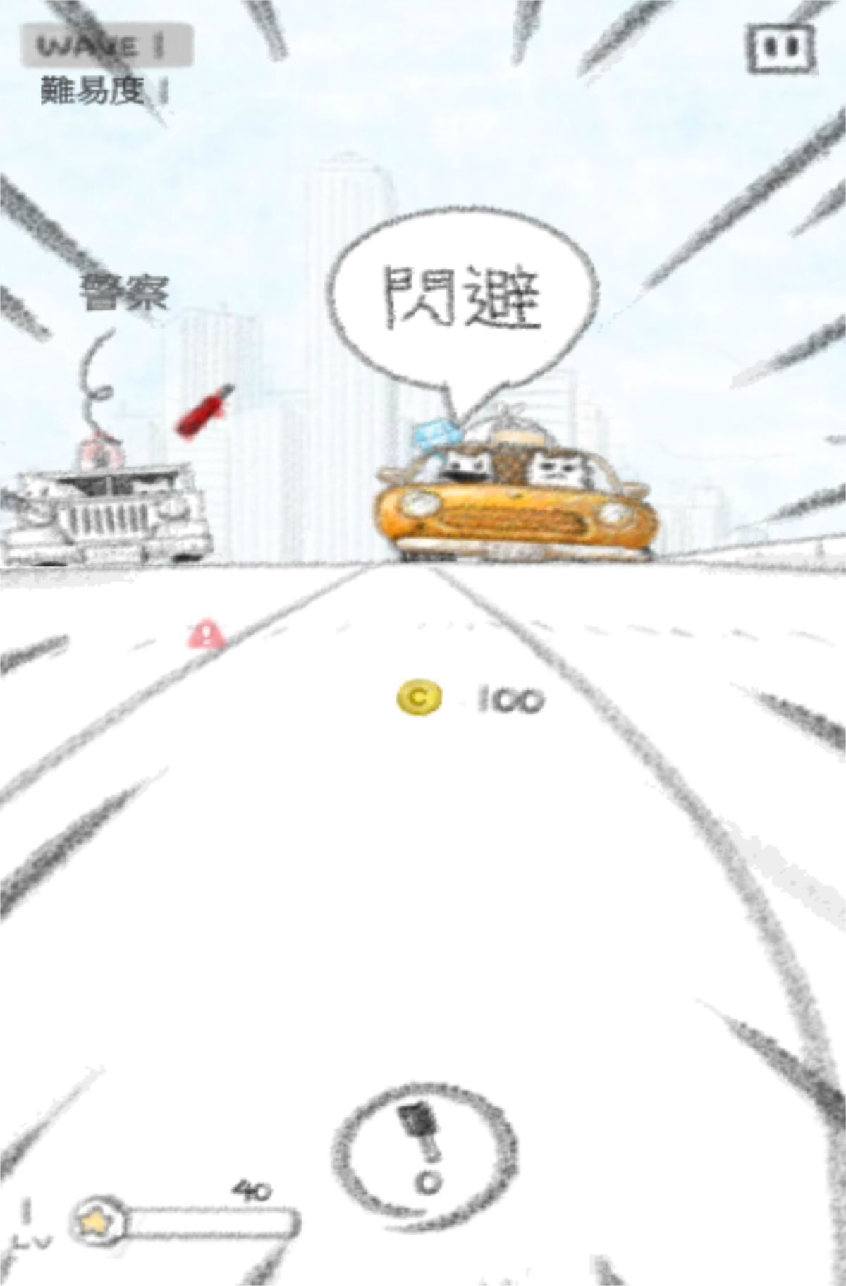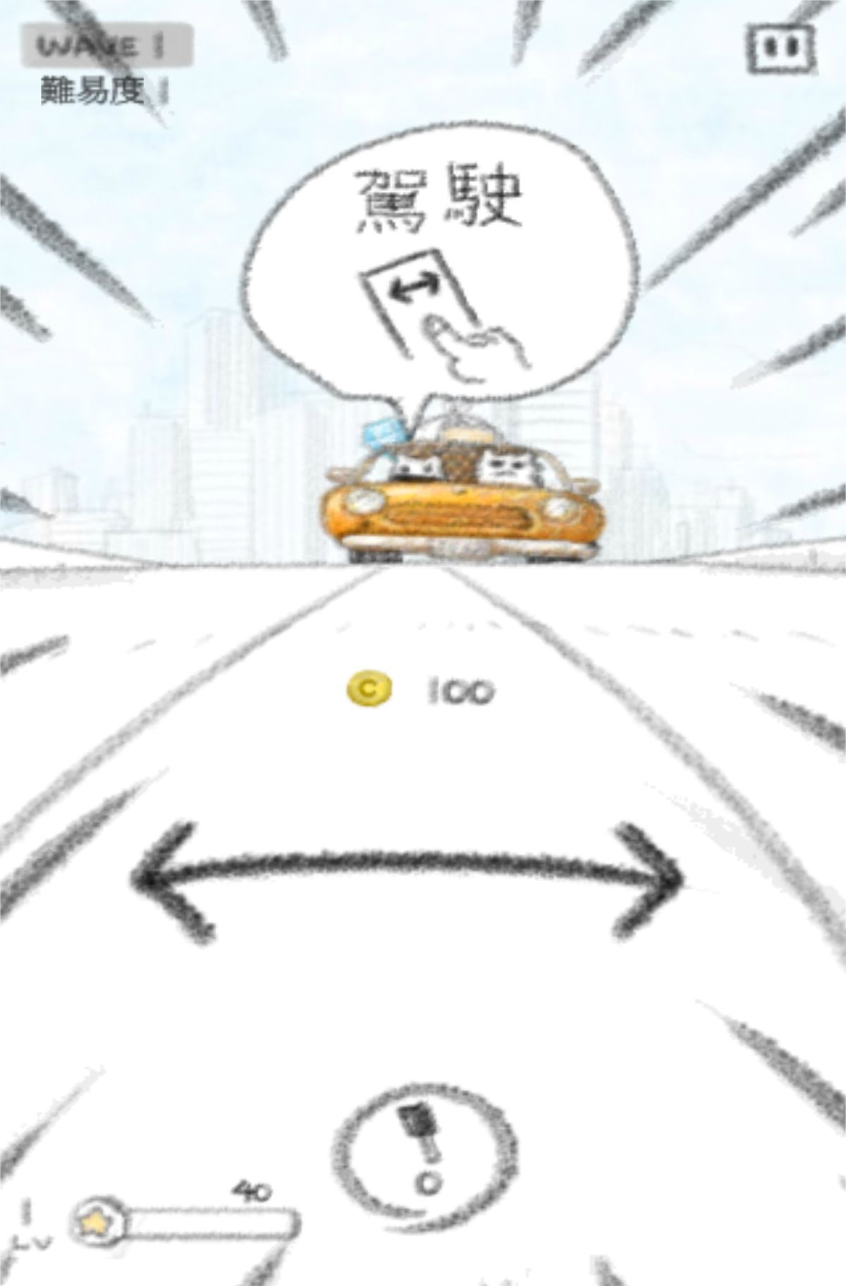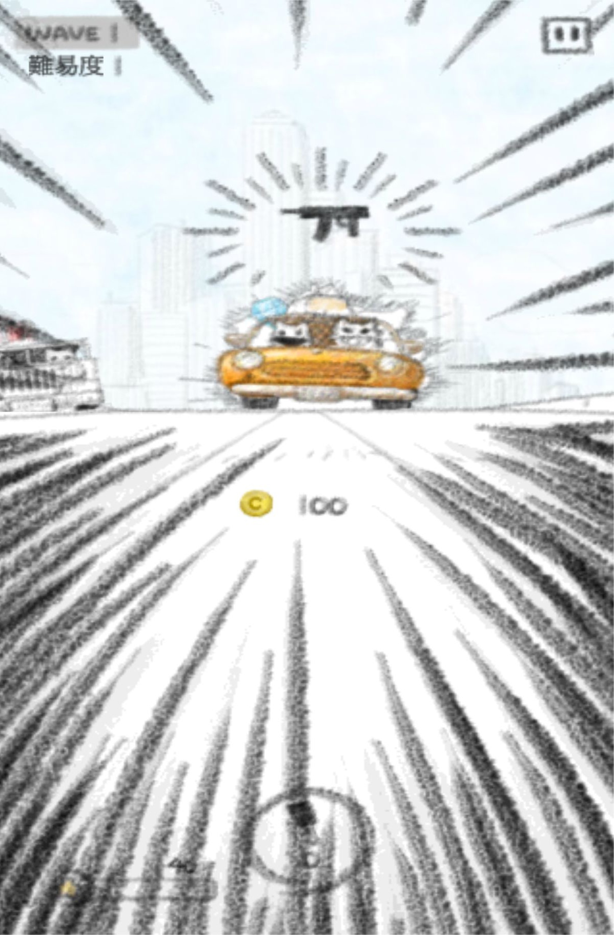 本作除了畫面相當生動之外,操作起來意外地相當的簡單好上手。進入關卡畫面後,玩家要做的就是用手指拖曳車子的左右位置,以閃躲敵人的攻擊、拾取關卡途中掉落的金幣,再加上偶爾手動點選下方的手榴彈圖示扔個芭樂。只要玩家將車子移近後方的追兵旁邊,敵方的車輛上便會出現瞄準的方框,車上的貓咪就會自動拿起武器掃射敵人,完全不需要玩家手忙腳亂的操作。覺得這樣還不夠簡單嗎?本作還有個相當貼心的設計,就是當玩家真的有事非放開的你的手指不可的時候,遊戲就會自動進入「自動模式」由電腦接手,連閃避都會包辦喔!