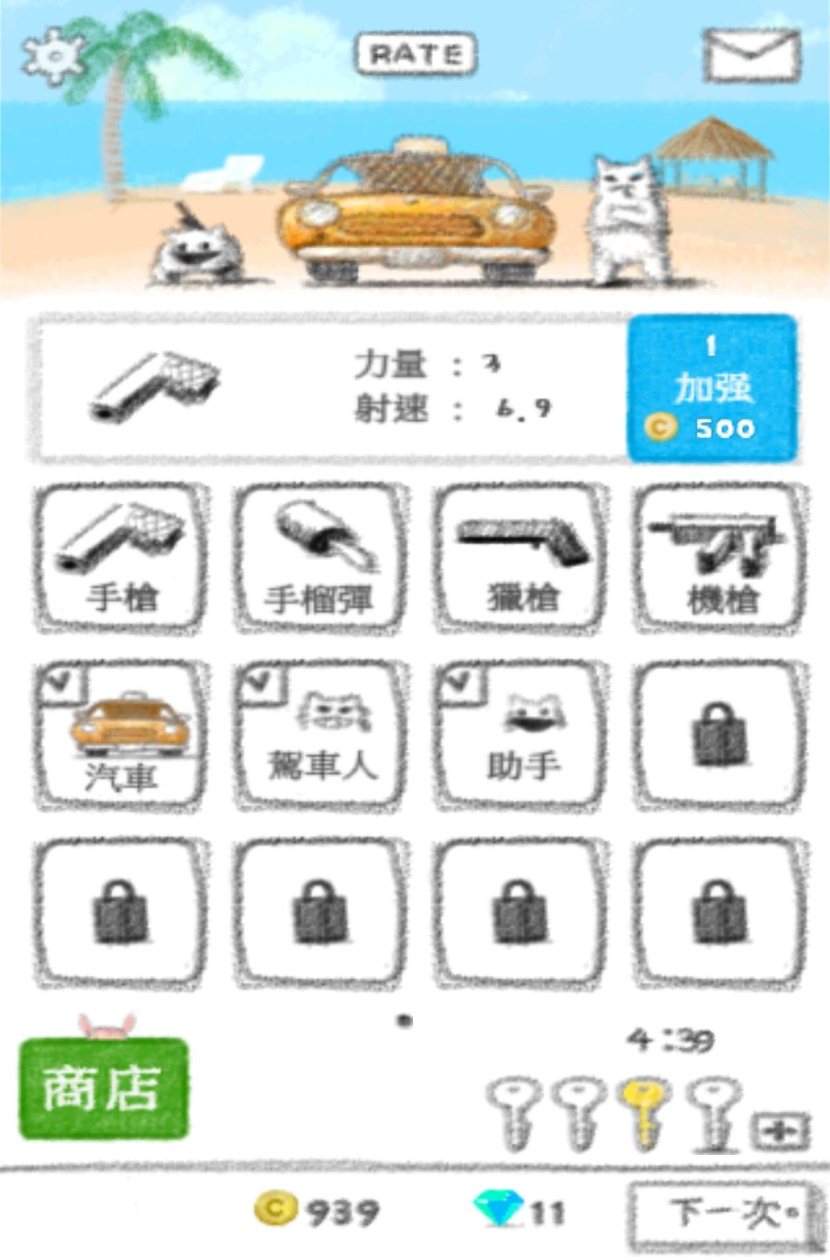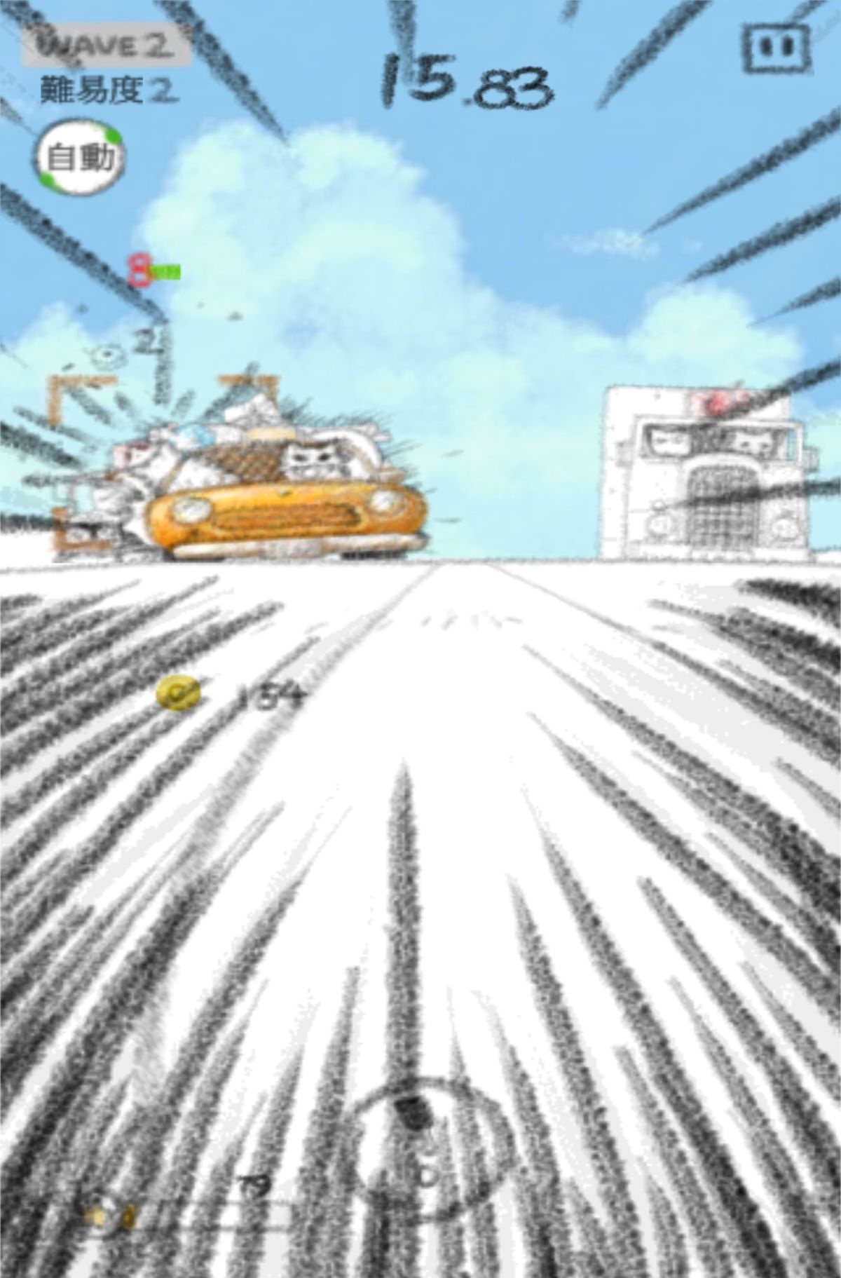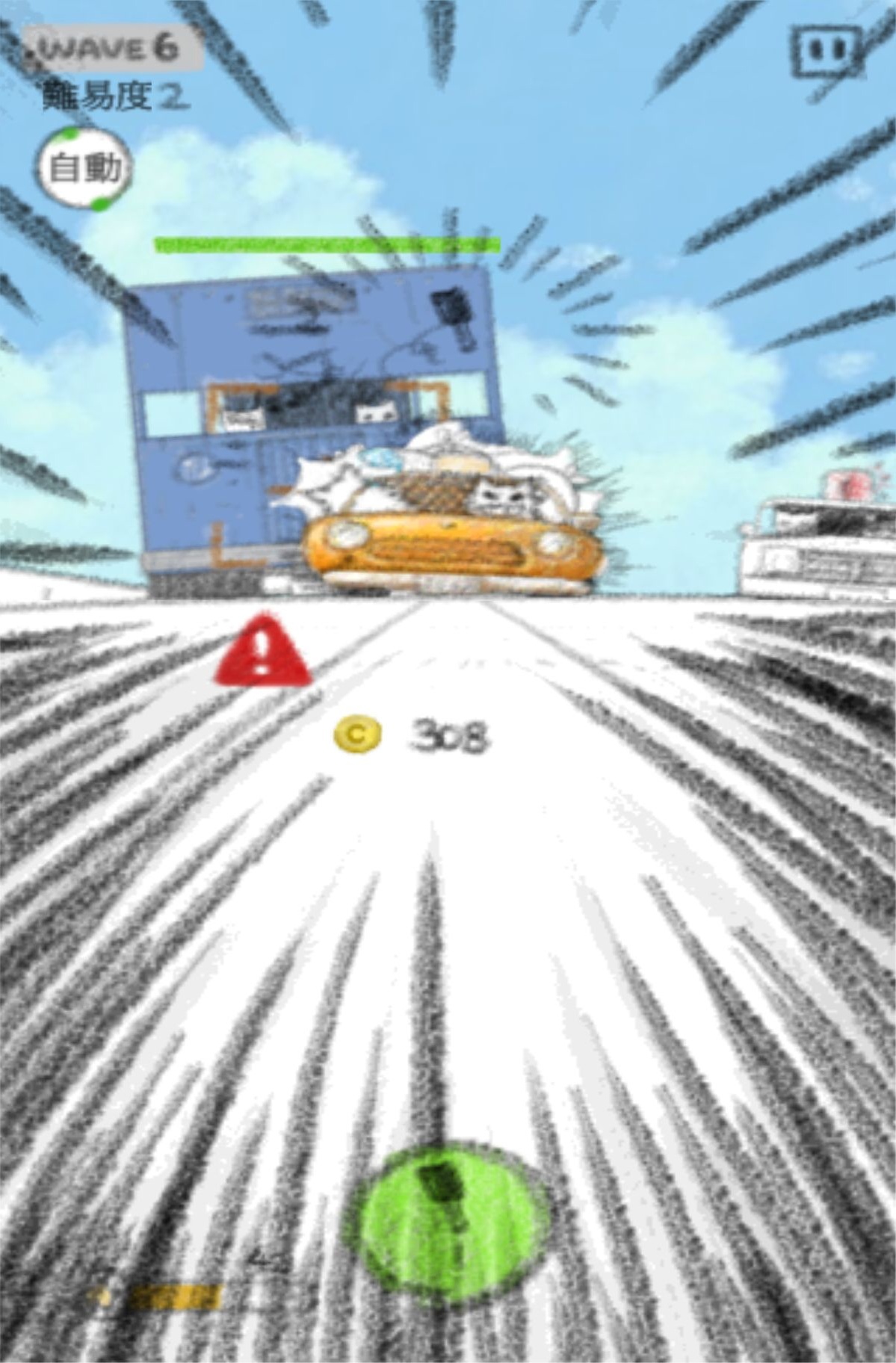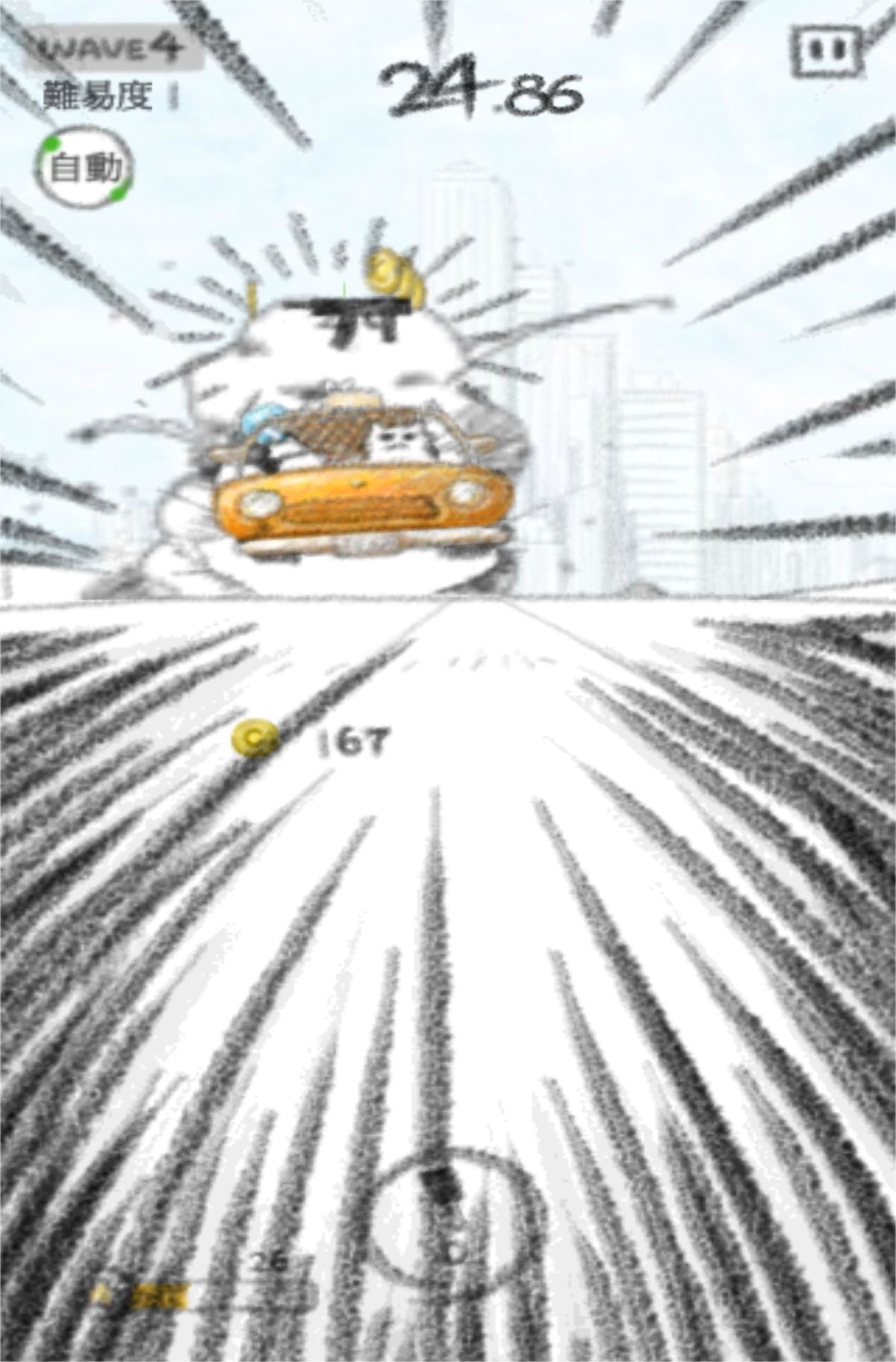 本作除了畫面相當生動之外,操作起來意外地相當的簡單好上手。進入關卡畫面後,玩家要做的就是用手指拖曳車子的左右位置,以閃躲敵人的攻擊、拾取關卡途中掉落的金幣,再加上偶爾手動點選下方的手榴彈圖示扔個芭樂。只要玩家將車子移近後方的追兵旁邊,敵方的車輛上便會出現瞄準的方框,車上的貓咪就會自動拿起武器掃射敵人,完全不需要玩家手忙腳亂的操作。覺得這樣還不夠簡單嗎?本作還有個相當貼心的設計,就是當玩家真的有事非放開的你的手指不可的時候,遊戲就會自動進入「自動模式」由電腦接手,連閃避都會包辦喔!