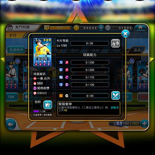 本次更新在人物卡片上加入了等級系統,以往教練們在訓練時只有增加球員的能力值,現在還可以訓練卡片等級了,當卡片等級上升後,球員的能力也會相對應的增加。而同樣的人物不同等級時,球員的能力值可是天差地遠的喔!所以想要場場全壘打或是球球三振的教練,可要安排好主要的球星,抓緊時間操下去囉。