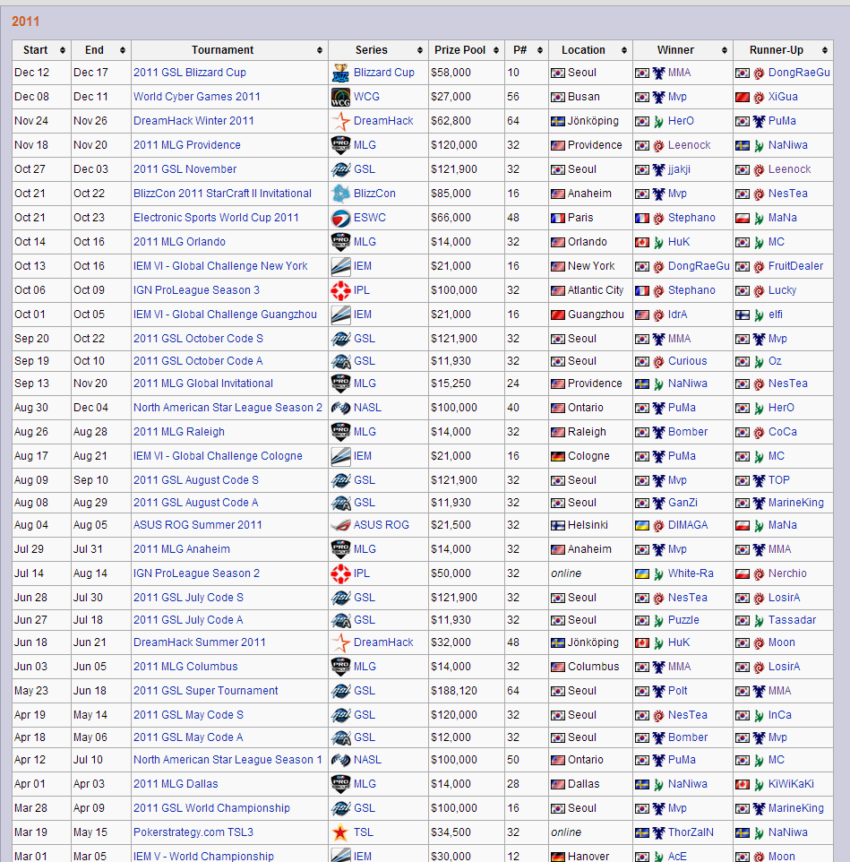 <上圖為 2011 年《星海爭霸 2》所舉辦的菁英等級賽事。圖片來源:Liquidpedia>