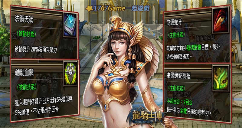 絕美豔后是一個輔助技能最多的輸出英雄,不論是在副本或者是各種挑戰上清怪,都是最具重要性的輔助角色,當然通常輔助性輸出英雄的缺點就是防禦能力差與血量較少…所以絕美豔后擁有個保護自己的保命技能─高級蝮蛇祝福。這個技能的使用時機點,是玩家在戰鬥中贏對手的重要關鍵。若想提高攻擊與防禦,在困境時也適時地擺脫眼前的兇敵,絕美豔后將會是你不可或缺的另一半。