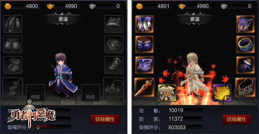 勇者鬥惡魔 》遊戲中,對於戰鬥擁有極高的自由度,除了技能招數、等級影響戰力,身上裝備的屬性與搭配,都成了與對手交戰成敗的核心關鍵。裝備系統中勇者裝備可分為「白」、「綠」、「藍」、「紫」、「橙」及神秘的第六大元素,玩家們可透過「強化」、「升級」、「洗鍊」、「轉移」、「鑲嵌」及「分解」等功能來打造勇者神裝。