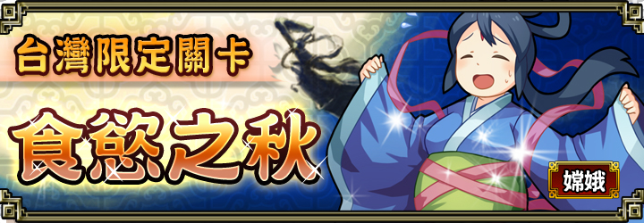 中秋節「食慾之秋」台灣限定關卡,於即日起至9月16日13:59止,美味至上發福開戰!關卡以耳熟能詳的神話故事嫦娥奔月為主題,並以KUSO方式顛覆玩家對貌美如仙的嫦娥的看法,玩家除了在關卡中面臨英俊猛將「射月傳說–后羿」的狠箭挑戰外,也將遇到受中秋美食與烤肉誘惑,而墮入萬惡發福深淵的廣寒宮「月圓娥圓–嫦娥」,遲遲無法甩肉、瘦身成功的嫦娥,怨念攻擊威力強大,玩家千萬得小心。