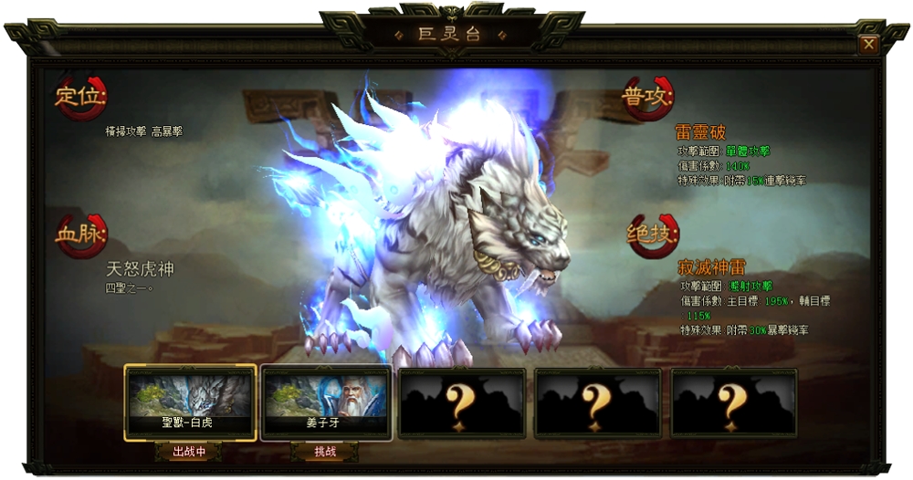 【巨靈台】系統玩法:巨靈台存在著各種巨大無比和超強能力的聖獸,若向聖獸挑戰成功,該聖獸就可成為玩家的戰鬥夥伴,並可穿戴裝備、鑲嵌鬼神陣等,意即:聖獸可額外成為戰鬥中的第六人。