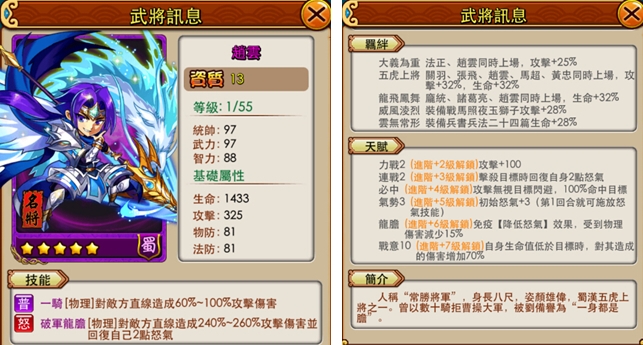 趙雲屬於穩定的輸出且百發百中的戰場好手,是遊戲中的閃避王,玩家們可以放前排或者有針對性的位子進行閃避攻擊,是一個火力即高的強勁戰友。