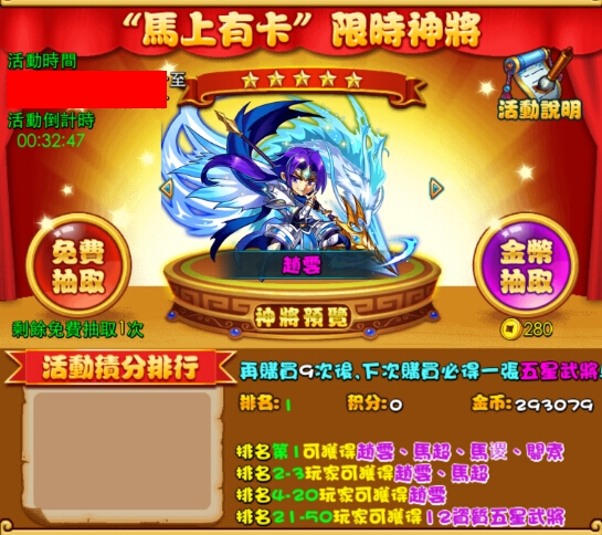 玩家透過遊戲中主介面「精彩活動」內參加【限時神將】活動,多位五星神將等您領取,更有機會活得經典神將!