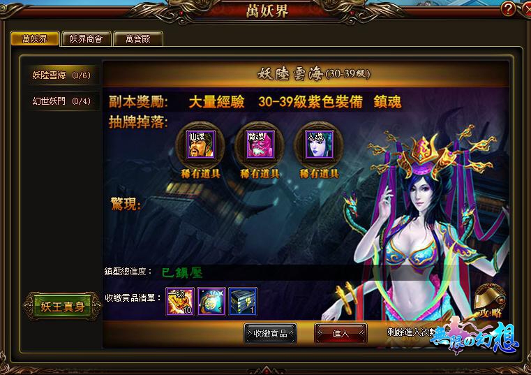 在萬妖界中玩家可以獲得大量超強屬性裝備和稀有道具,還能獲得大量經驗獎勵,通關整層副本之後更能每天領取貢品。所以萬妖界是必打的副本之一。