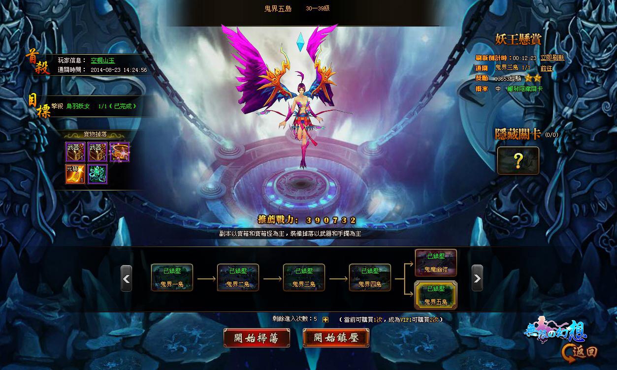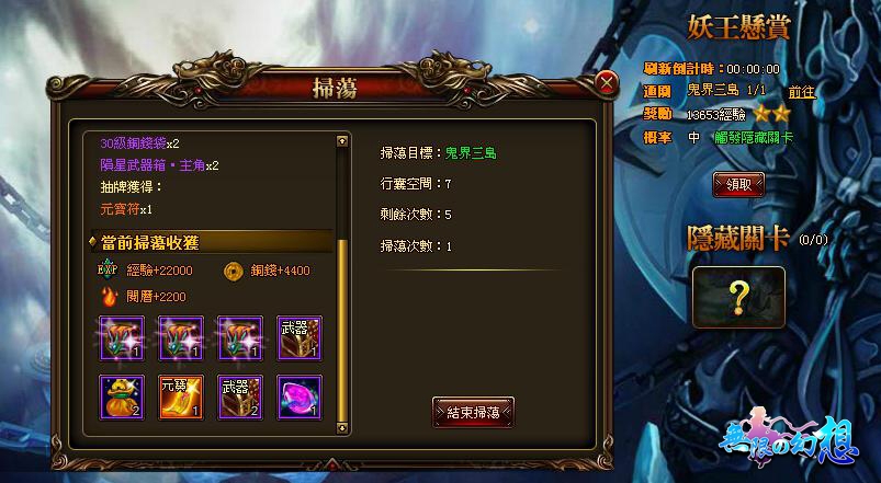 整層副本全部通關完之後即可使用掃蕩功能,並開啟妖王懸賞,完成懸賞任務有機率觸發隱藏關卡。