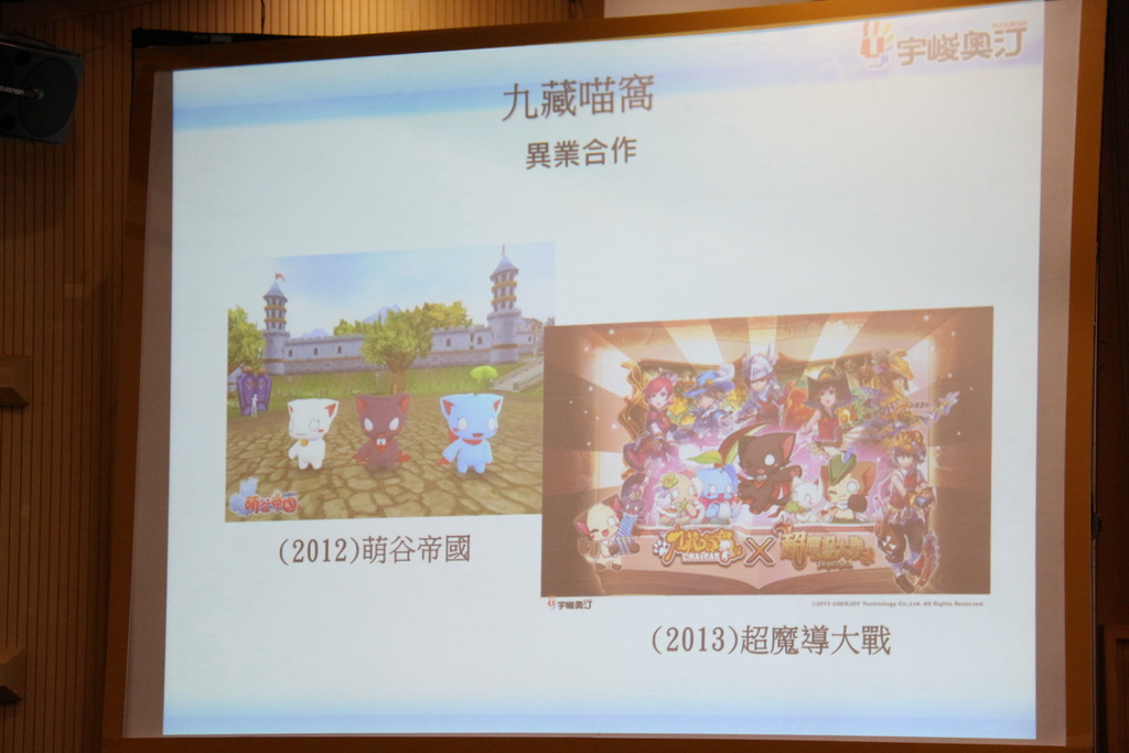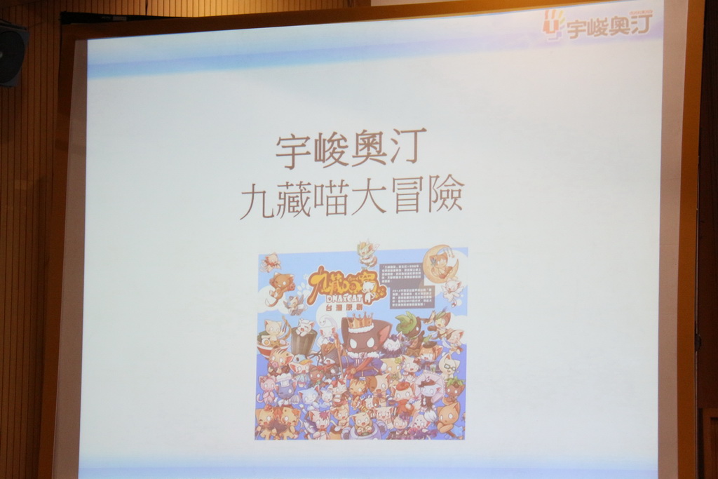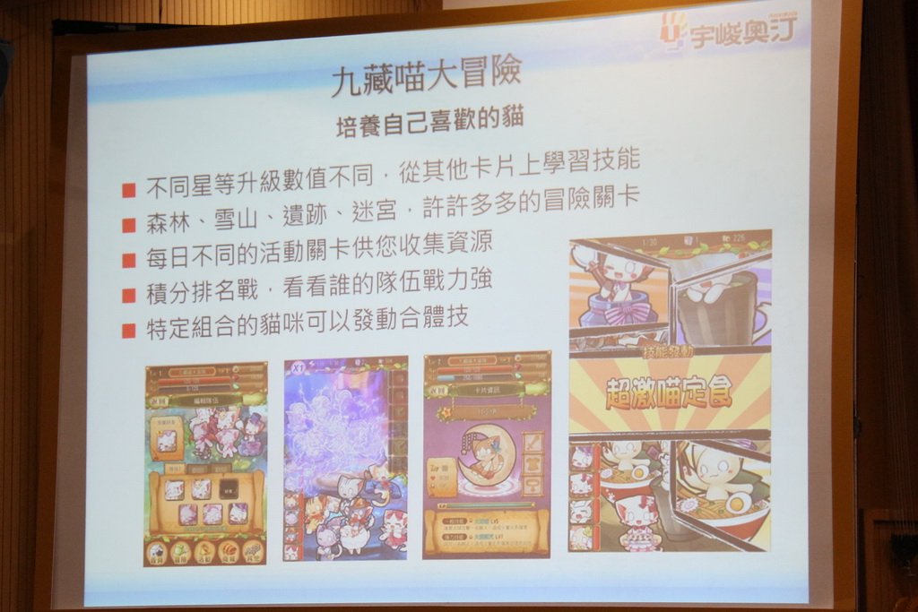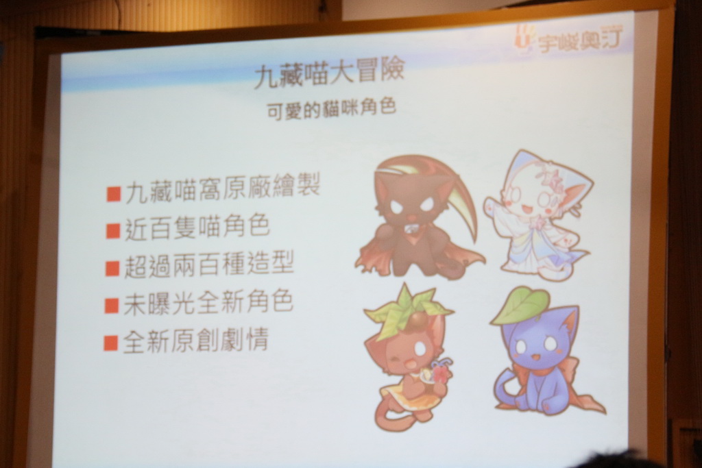 九藏喵大冒險》,這是一款與台灣文創團隊合作的手機遊戲。《九藏喵窩》在大陸、新加坡、馬來西亞都有一定的人氣,目前也已經有動畫、漫畫,和眾多的周邊產品。為什麼選擇與《九藏喵窩》合作推出新遊戲?劉信解釋,主要是因為宇峻奧汀曾在兩款線上遊戲《萌谷帝國》與《超魔導大戰》推出《九藏喵窩》合作商品,後來發現與他們合作的商品都非常受歡迎,且銷售都會多出 3 至 5 成,因此才希望能進行更深度的合作。