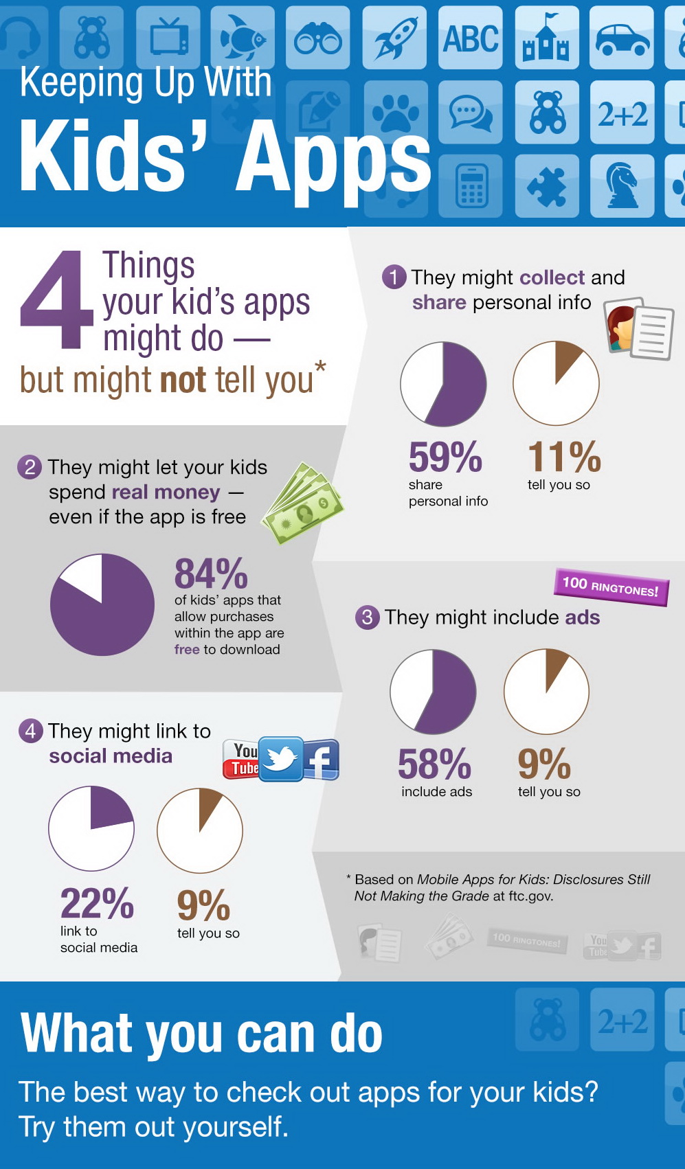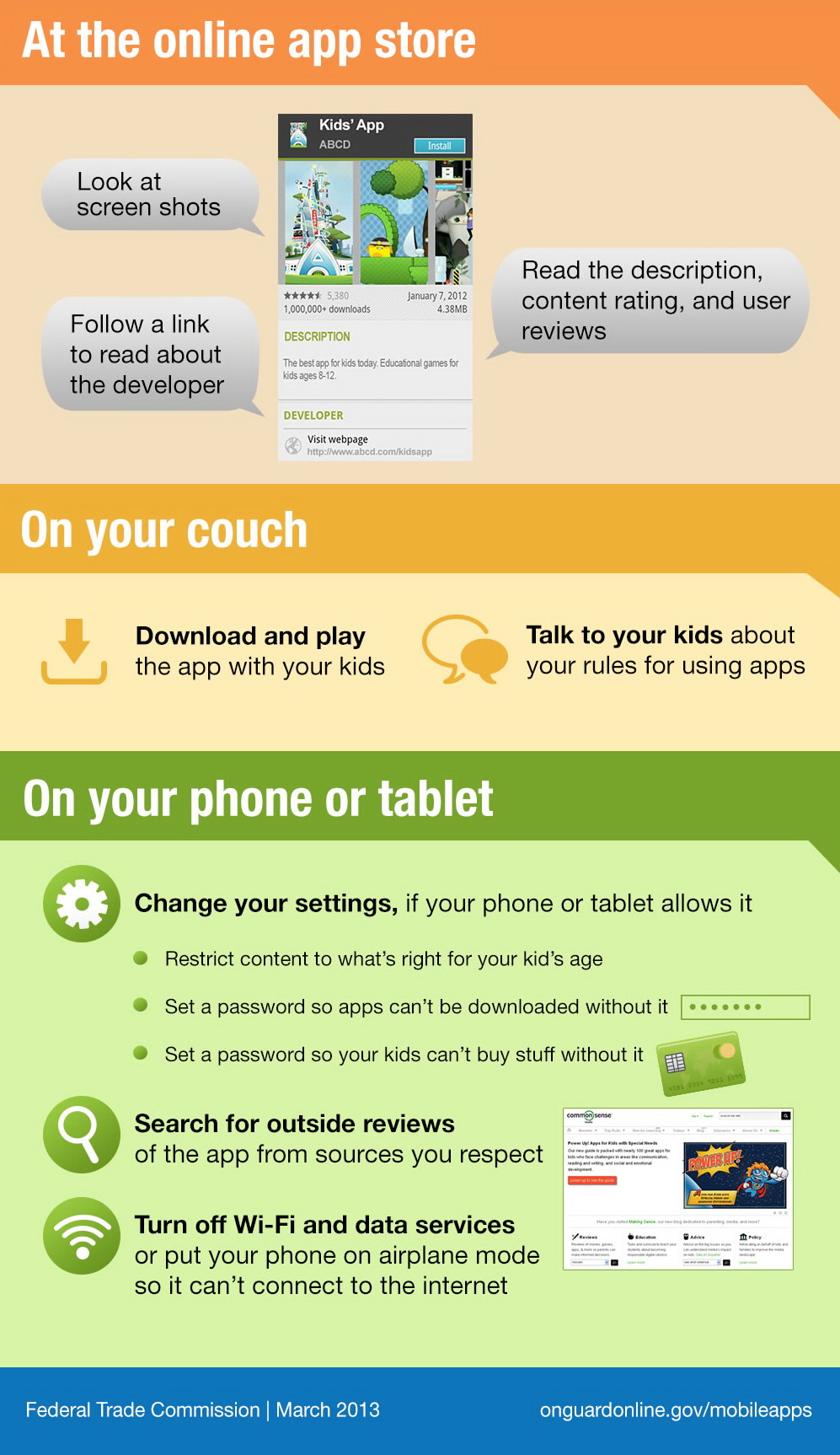 FTC 表示,自 2011 年以來,Google 即違反聯邦法令:當孩童在程式內誤購,卻向不知情的父母收取費用。2012 後半年,系統曾加入彈出視窗,要求用戶在購買前輸入個人帳號密碼,但未包含收費相關資訊,也未通知密碼有效期間為 30 分鐘。在這段期間內,兒童即有可能使用其行動裝置,接續付費下載。