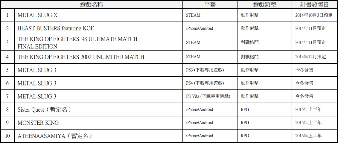 SNK PLAYMORE 近日發布新聞稿,正式對外公布了自今年秋季至 2014 年上半年的預計發售遊戲作品一覽。