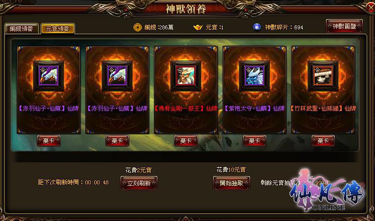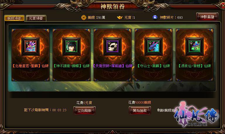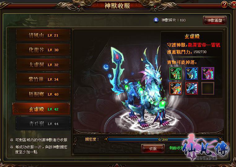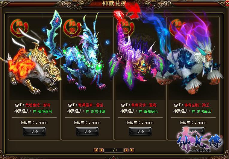仙凡傳》世界中有許許多多強力神獸,只要你用足夠的實力便可駕馭它們。在神獸收服中,每一關都有一隻守護神獸,需要打敗守護神獸才可獲得各種神獸令牌,打開神獸令牌即可獲得指定神獸。