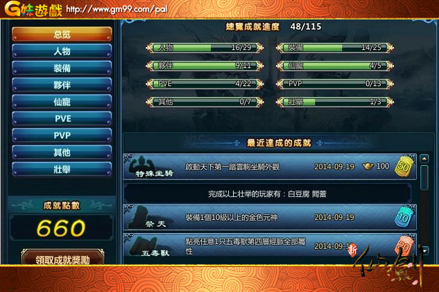 《新仙劍》新系統「成就」介面圖