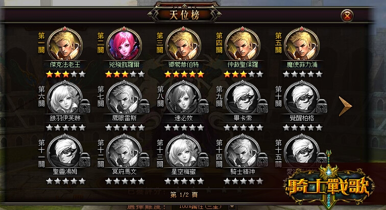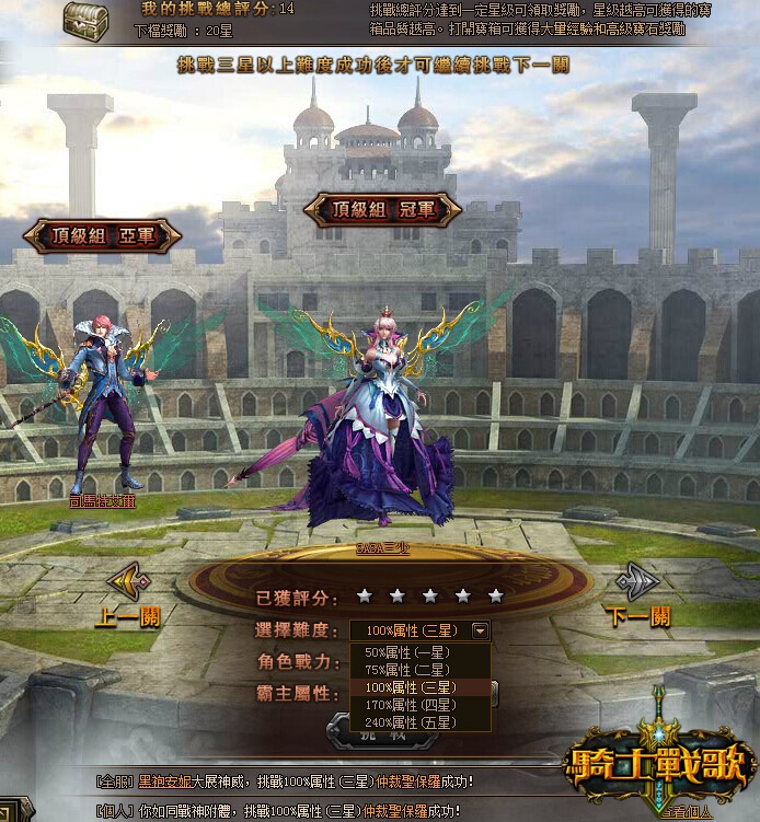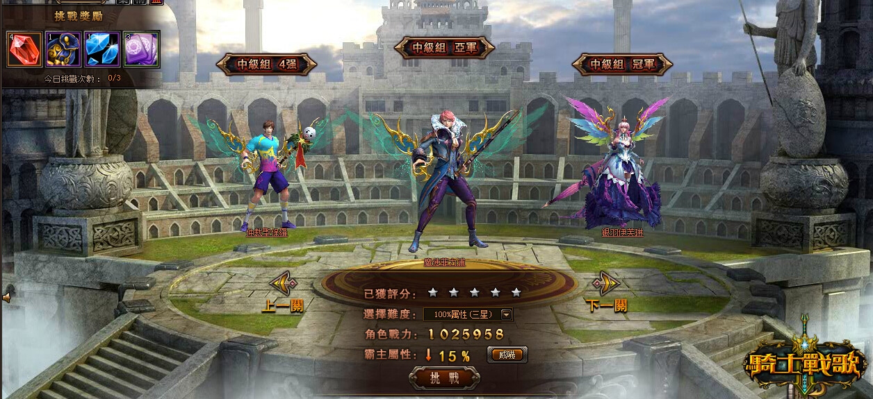 2、玩家按照低級組冠亞軍、中級組四強、高級組八強的順序進行挑戰,必須達到 3 星評分以上才可以選擇挑戰下一關。