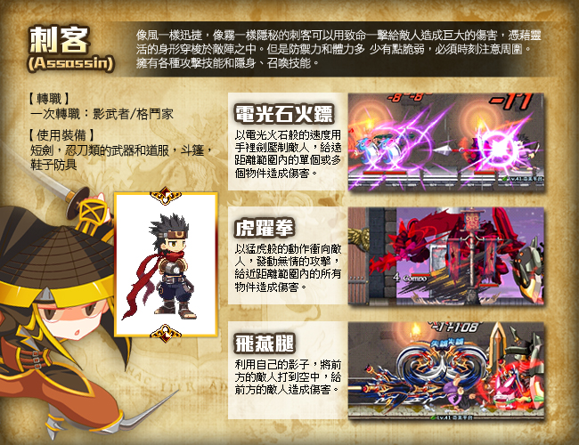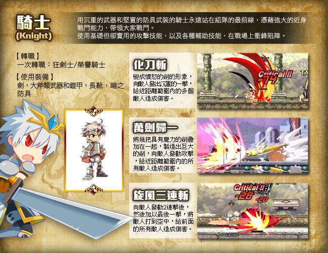 遊戲劃分了四大主要職業:騎士、魔法師、刺客、射手,並將於未來開放女劍士職業。遊戲中的每個職業各有不同的特色與能力,玩家可參考以下介紹。