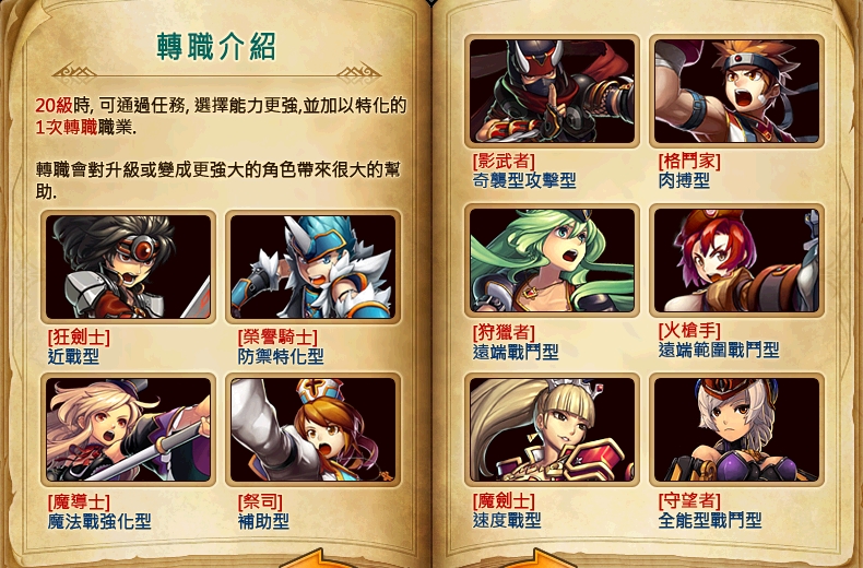 玩家分別可在 20、40 級時,通過任務,選擇更強力的 1、2 轉職業。同時每次轉職都可以增加專屬的技能與特性,增加玩家的屬性及戰力。