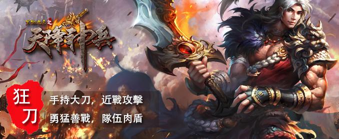 男性,手持大刀,近戰攻擊,擅長群攻,高血量,高防禦,意志過人,勇猛善戰。類似其他遊戲中的武器戰士。狂刀還具有一定的單體控制能力,是一個較為強大的職業,缺點在於必須近身戰鬥才能傷害對手,並且沒有團隊輔助能力,狂刀是三大職業中操作最為簡單的職業,很適合新手玩家上手。