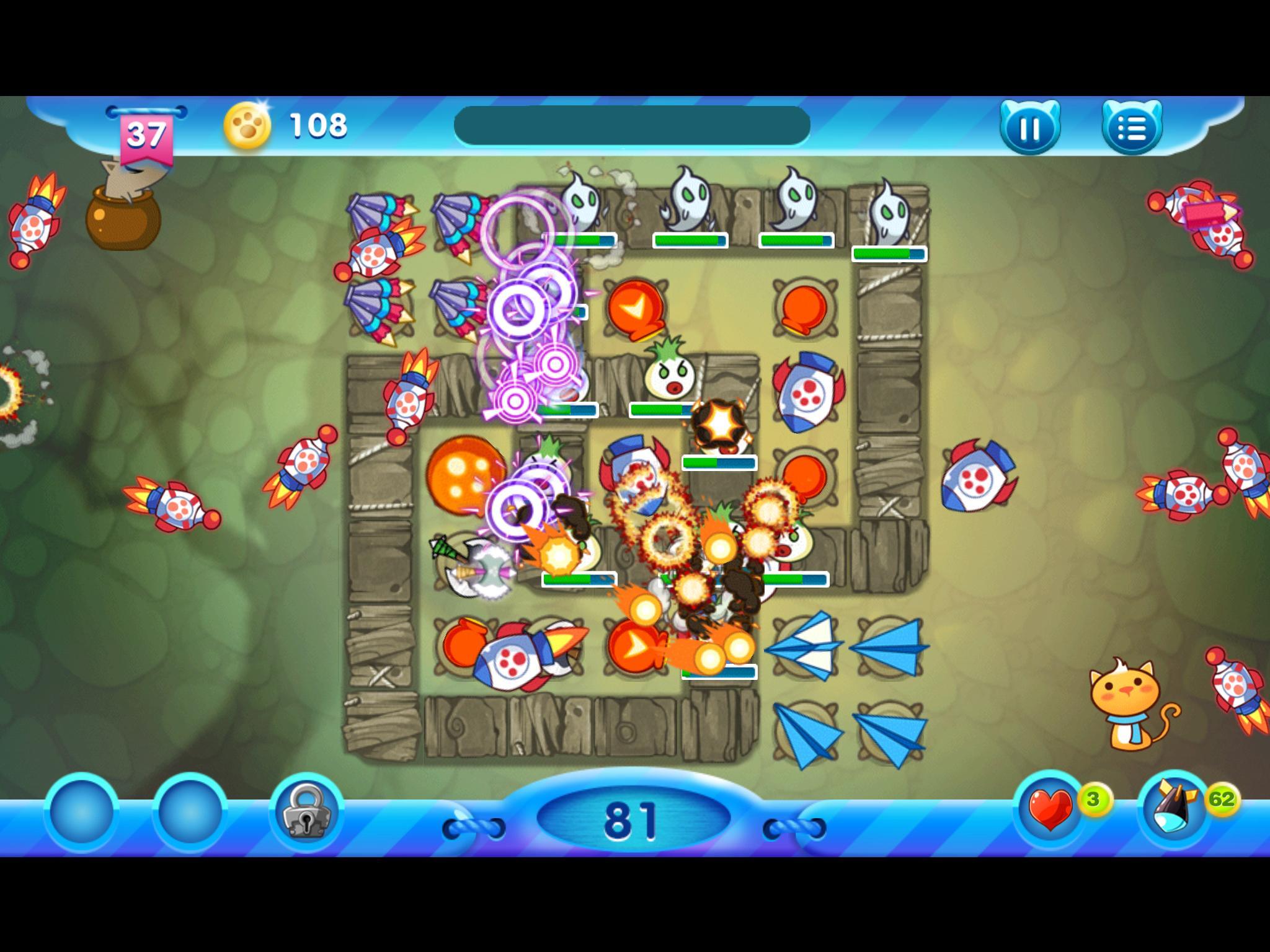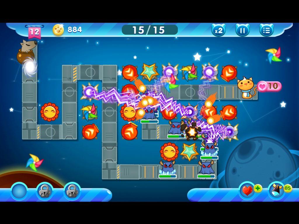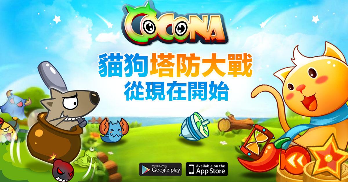 COCONA》裡,面對狗狗大軍,貓咪除了躲在塔上之外,這次可以滑滑手指蓋出能快速射擊的「瓶子」、能射出帶有爆炸效果的「星星」、範圍攻擊打一群怪的「向日葵」、一次打一排還附帶緩速效果的「風車」、前後發射帶有眩暈效果的「沙漏」、不只打群怪還帶緩速的「雪花」、一次打三個目標的高傷害砲塔「雷雲」、一次能攻擊多數的高傷害砲塔「鉛筆」、能一次打一排怪的高傷害砲塔「紙飛機」、能穿透攻擊多個目標並觸發爆炸的「飛彈」,以及能一次發射多發氣泡的「陀螺」,共 12 種砲塔幫助你保護喵咪,而且還能針對自己喜好來進行各別的升級喔!