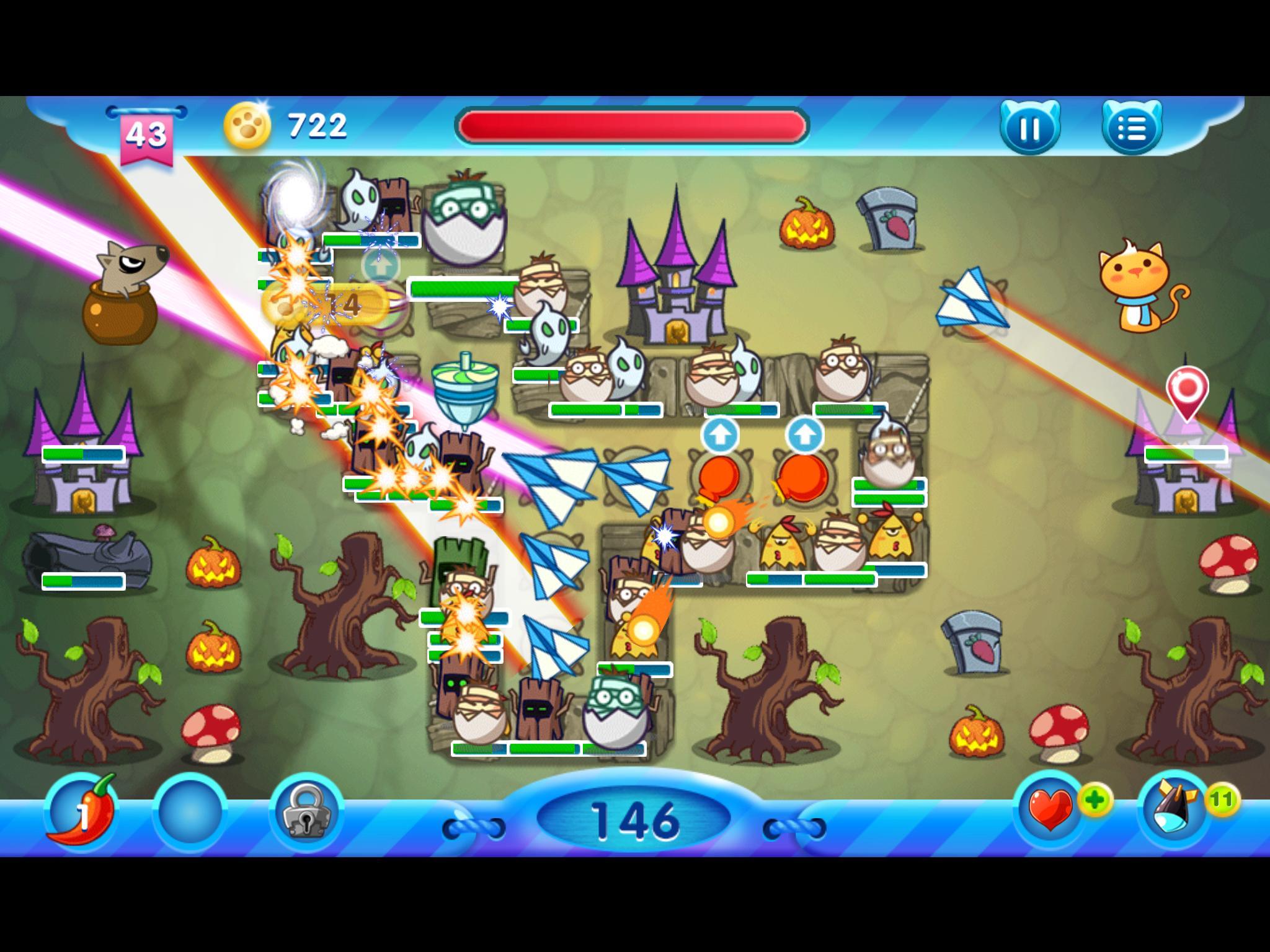 除了貓咪 12 種功能各不相同的砲塔,這次狗狗也精銳盡出,像是「尖尖」、「碟子」、「幽幽」、「怪怪」和「呆呆」能快速衝向貓咪的怪物軍團需要你來蓋起帶有緩速效果的塔來防禦;而「猛牛」、「蛋蛋」、「鉗子」、「木木」、「爆彈」這類高血量的塔則需要玩家趕緊建立高傷害的塔來防禦喔!另外,還有像是帶著滿滿金幣的「錢鼠」,以及全身黏呼呼的「毛毛」出現時可是首要攻擊目標,帶給你意想不到的好效果!多樣的怪物全面出籠,你準備好接招了嗎?