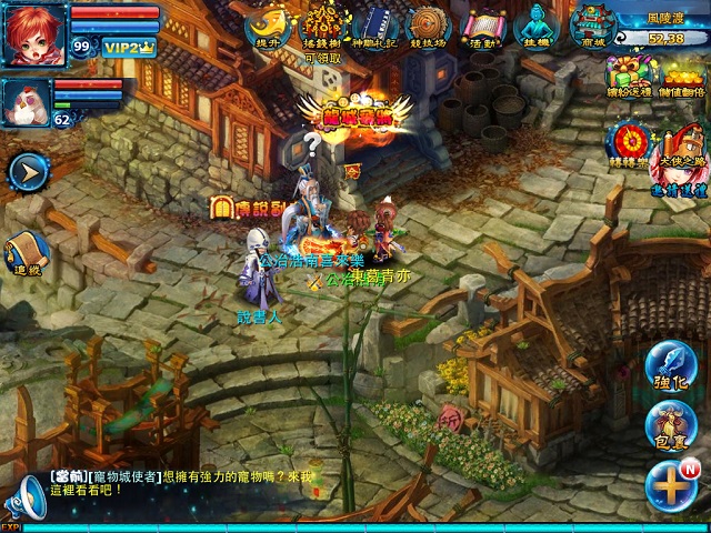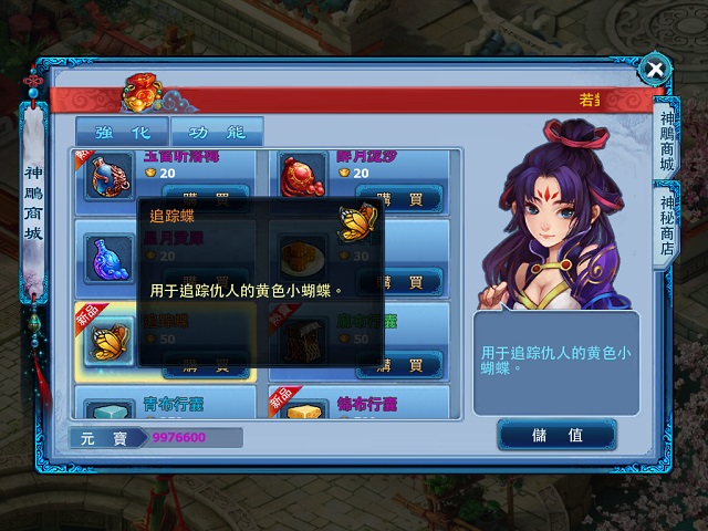 同時,新版本中玩家在PVP區域被殺掉後,殺人玩家的名字會被加入到被殺玩家的仇人列表裡。玩家如選擇進行複仇,可以去商城花費50元寶購買道具“追蹤蝶”,就可以獲取被追蹤玩家目前所在座標和地圖!復仇之路現在變得更簡單!此外,達到50級的玩家會獲得“倉庫來了”任務,完成任務即可獲得50元寶獎勵。倉庫管理員處點擊"我的倉庫"即可進入倉庫存放道具,玩家可以根據自身需求進行倉庫擴充,VIP用戶還可以使用隨身倉庫隨時隨地存取物品。