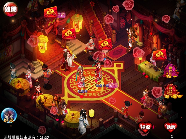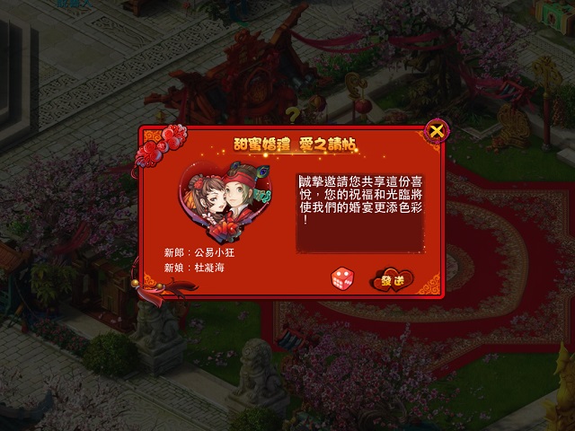 結婚系統玩法並不複雜,兩名等級達到50級的異性組隊到“月老”處就可以申請結婚。不過既然是結婚,就必須要兩人一起通過一項小考驗。“月老”會讓申請結婚的準新人走遍臨安、襄陽、嘉興和風凌渡,尋找雲遊四方的“喜來樂”,拿到為婚禮準備的煙花喜糖。但是請特別注意,“喜來樂”的坐標並不固定,要找他可沒那麼容易,準新人必須完成任務後才可以找月老舉行婚禮儀式喔。