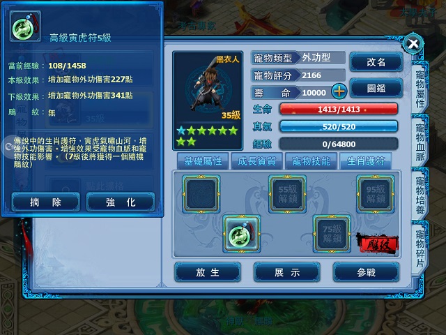 新版本中,寵物護符將伴隨寵物整個成長過程。擁有高級護符的寵物與普通寵物力量完全無法比較!寵物等級達到15級將開放第一個護符位,之後每20級開放一個新的護符位。每個寵物最多可以同時佩戴5個護符,相同的護符只能佩戴一個喔。