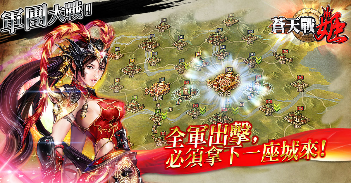 蒼天戰姬》這次改版增加了群雄逐鹿的「軍團攻城戰」系統,玩家可以在活動介面中點選參加。每年的春、夏、秋三季〈冬為休養生息之季〉會在軍團頻道進行廣播宣佈報名。
