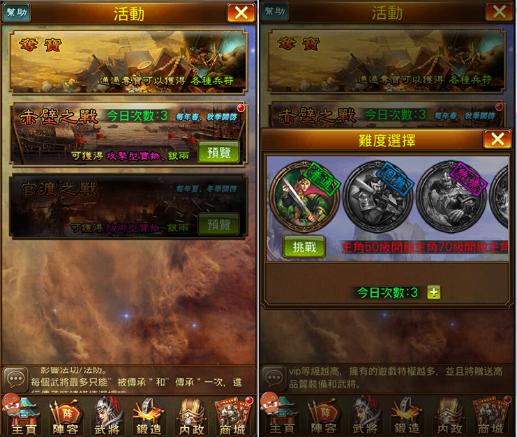 同時開放兩個活動副本,分別是【赤壁之戰】與【官渡之戰】,每個戰場分 5 種難度等級分別是:「普通」、「困難」、「絕境」、「煉獄」和「史詩」!玩家到達等級條件後開放,活動副本對應產出寶物、寶物碎片,還有銀兩、兵符等獎勵,難度越高的副本獎勵自然越豐厚!