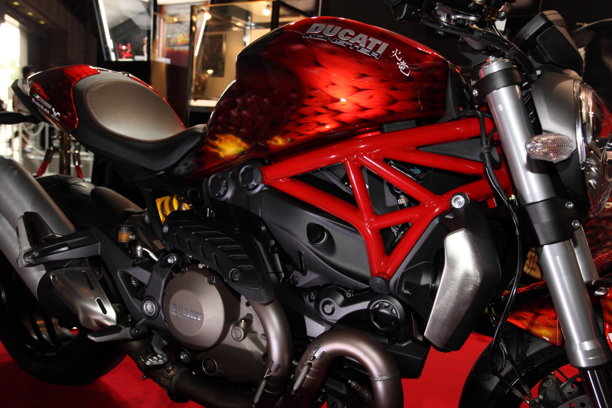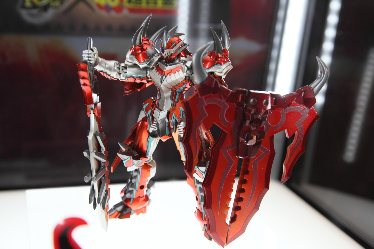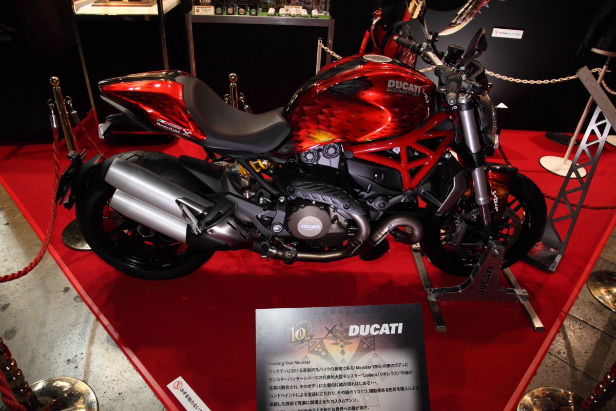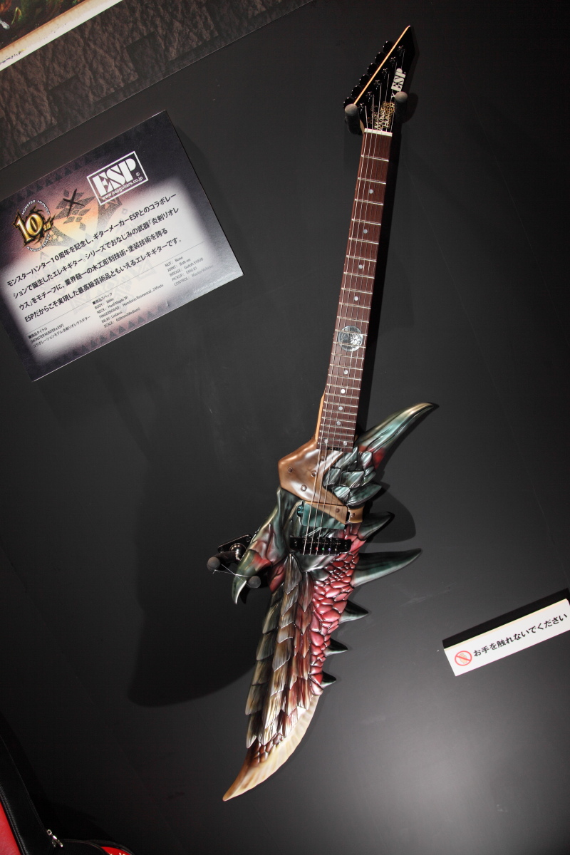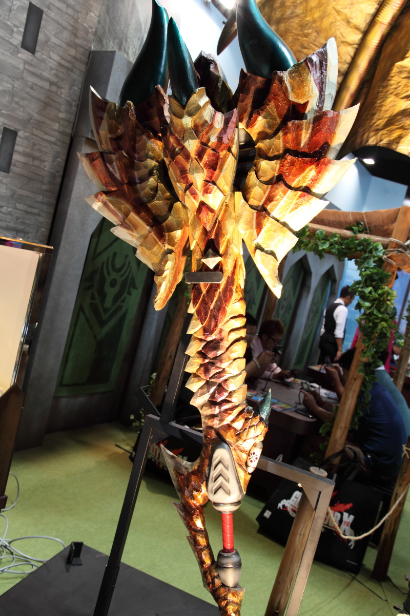 》主題魔物「千刃龍」塑像(雖然身體部分是打入空氣並非實心),在兩旁還擺出 1:1 的千刃龍男性獵人裝備以及充能斧,相當的搶眼吸睛。