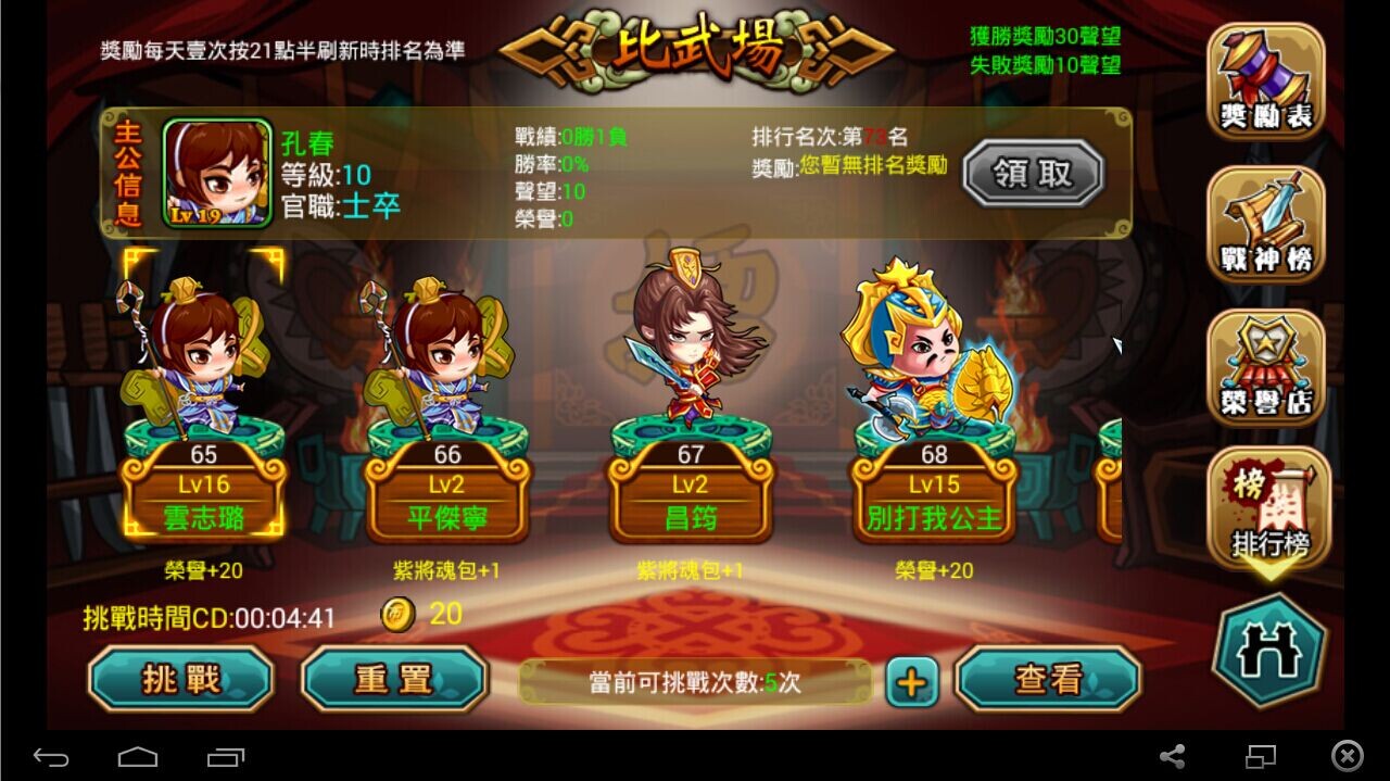《打我啊!主公!》的另一個特色系統是十級開放的“比武場”系統,每日與玩家切磋比拼,獲得聲望可提升“驃騎