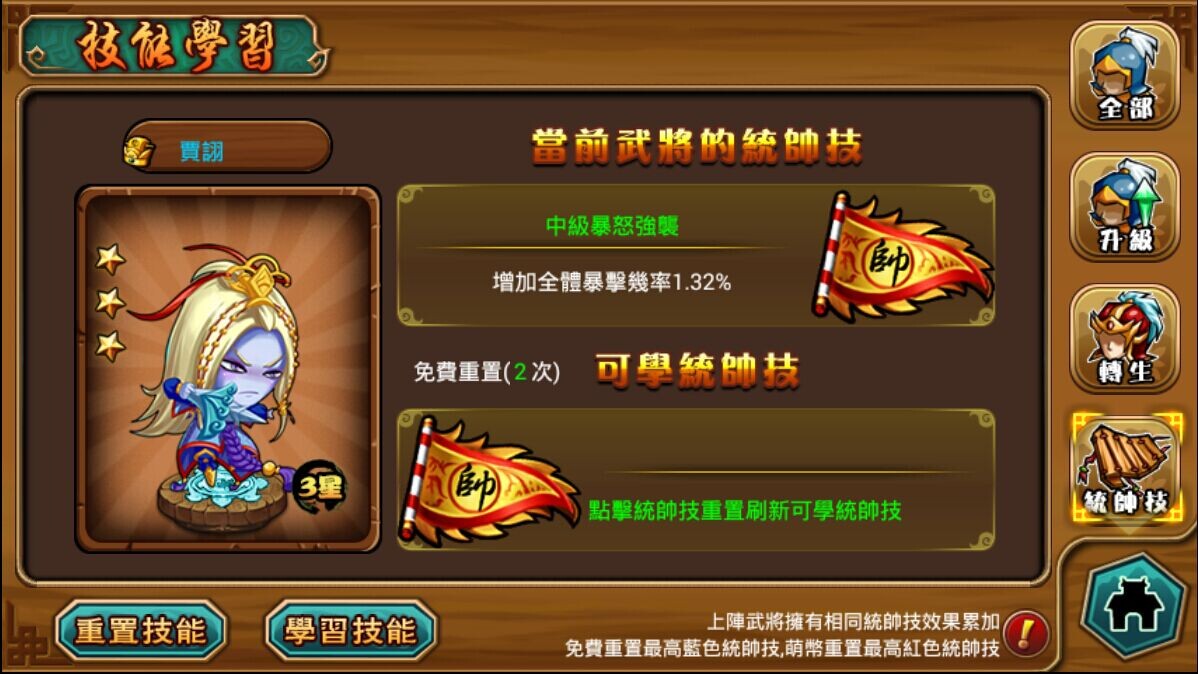 超豐富的武將成長系統,多達五百名武將供你挑選培養!可以對武將進行升級、轉生和學習統帥技,讓他們有更強的力量來幫助主公們戰鬥。玩家可以通過消耗萌幣及友情值進行尋將,更有活動副本獨家產出主角武將。武將按照品質的不同又分為白將、綠將、藍將、紫將四種等級,紫色的武將品質最高。不同品質的武將最大等級不同,紫色武將最高可升到 90 級。