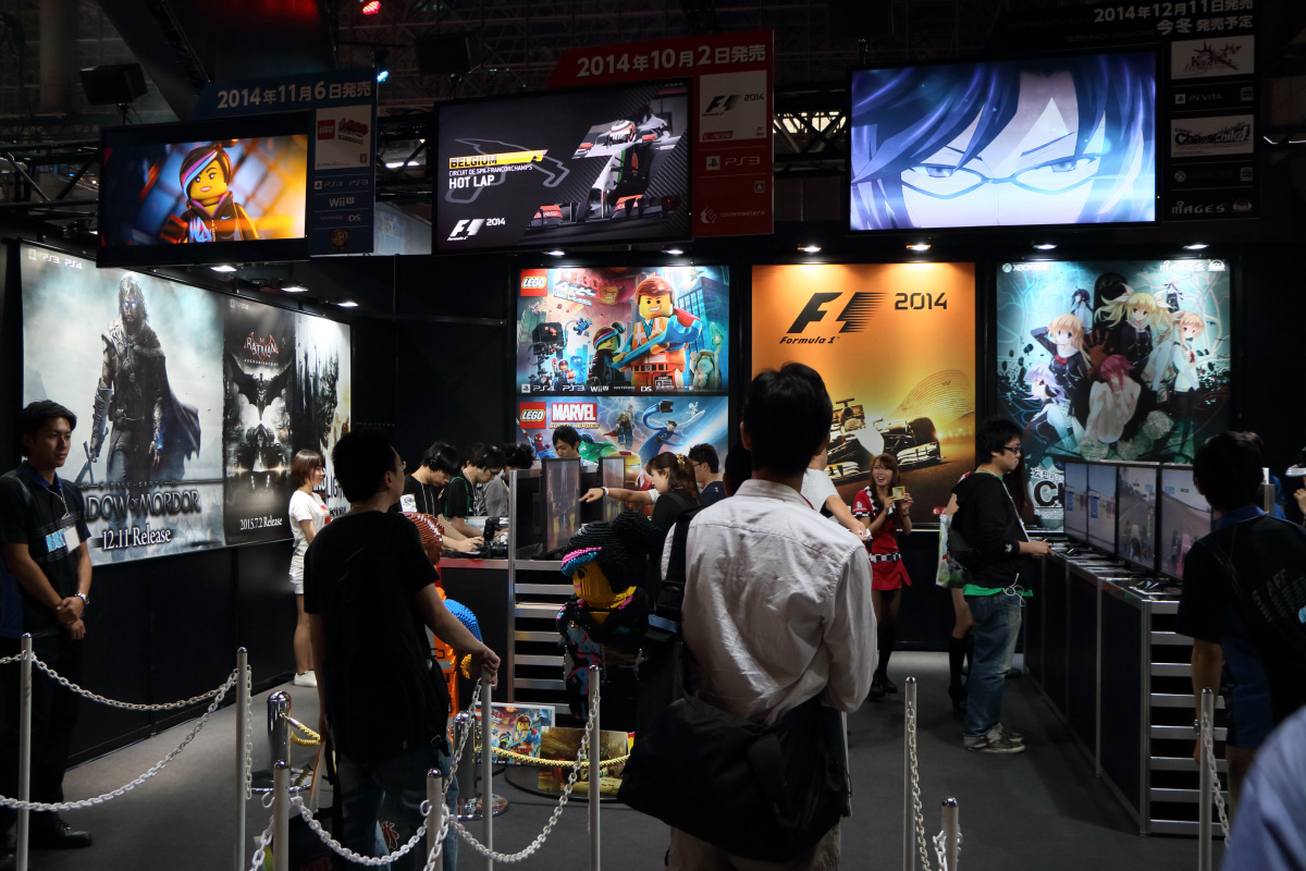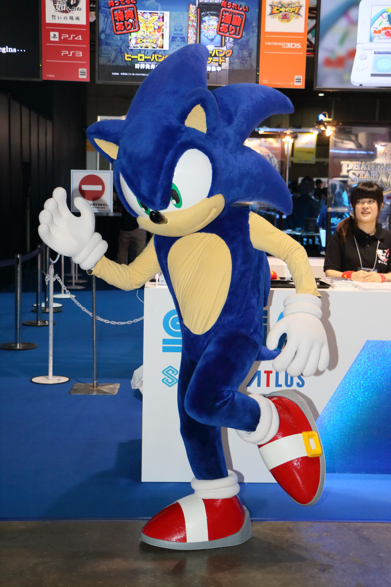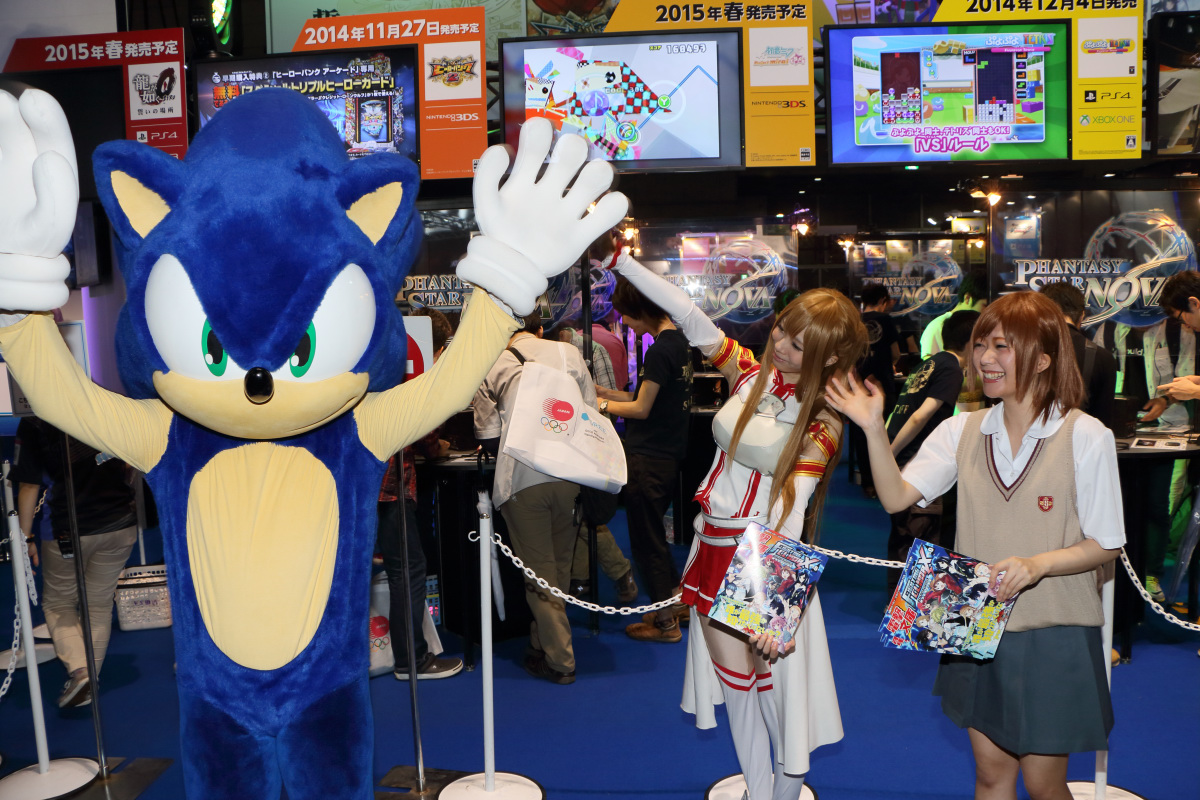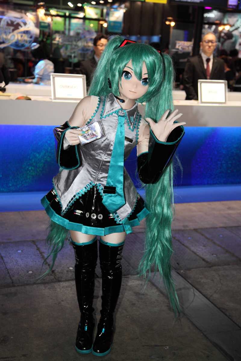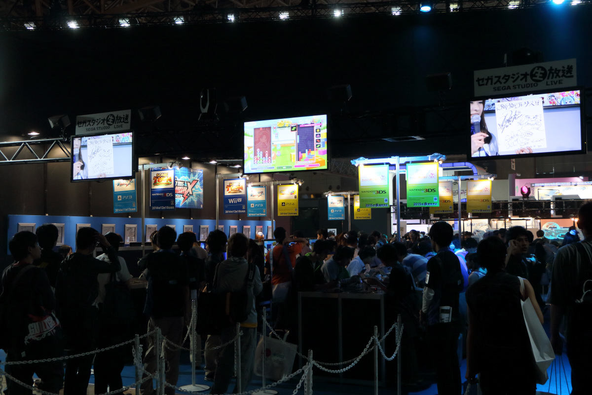 在這次東京電玩展中,SEGA 特別把票選前 10 名的性感女優請來現場,以超迷你閃亮連身裙與大網格網襪的性感姿態現身。由於這些性感女優本來就是人氣投票中脫穎而出的當家紅星,所以吸引了大批參觀者駐足拍照。在進場資格受管制的業者日雖然拍照者眾,但還在可控管程度之內,想拍到性感女優視線的好鏡頭還不算太難,但開放民眾入場的一般日,就得花費極大的功夫。