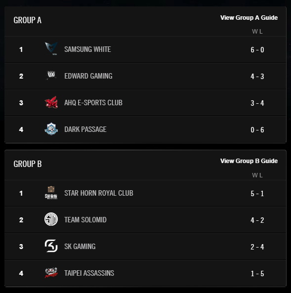 英雄聯盟》2014 世界大賽台北站進入最後一天,A、B 兩組 8 強資格出爐,A 組由取得 6 場勝利的 SSW ,以及 4 勝的 EDG 晉級,而 B 組則是 SHRC 和 TSM 獲得 8 強資格,屆時這 4 支隊伍將於 10 月前往韓國對戰。C、D 組的小組賽事預定 25 日在新加坡開打。