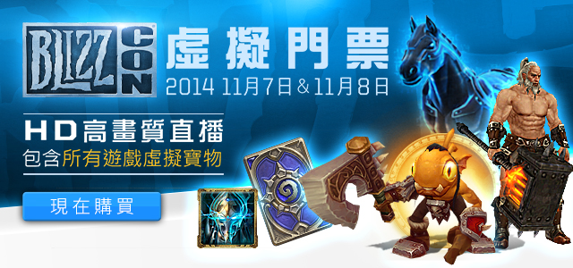 虛擬門票已於 9 月初開放購買,透過 BlizzCon 虛擬門票玩家不僅可以欣賞 BlizzCon 2014 HD 高畫質線上英文轉播的全部內容,還可獲得具紀念價值的限定虛擬寶物。