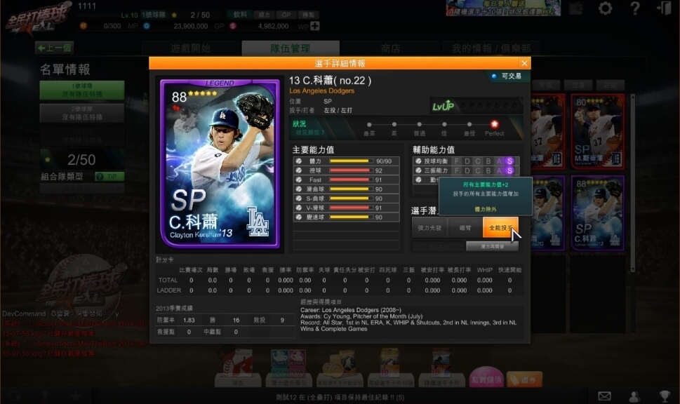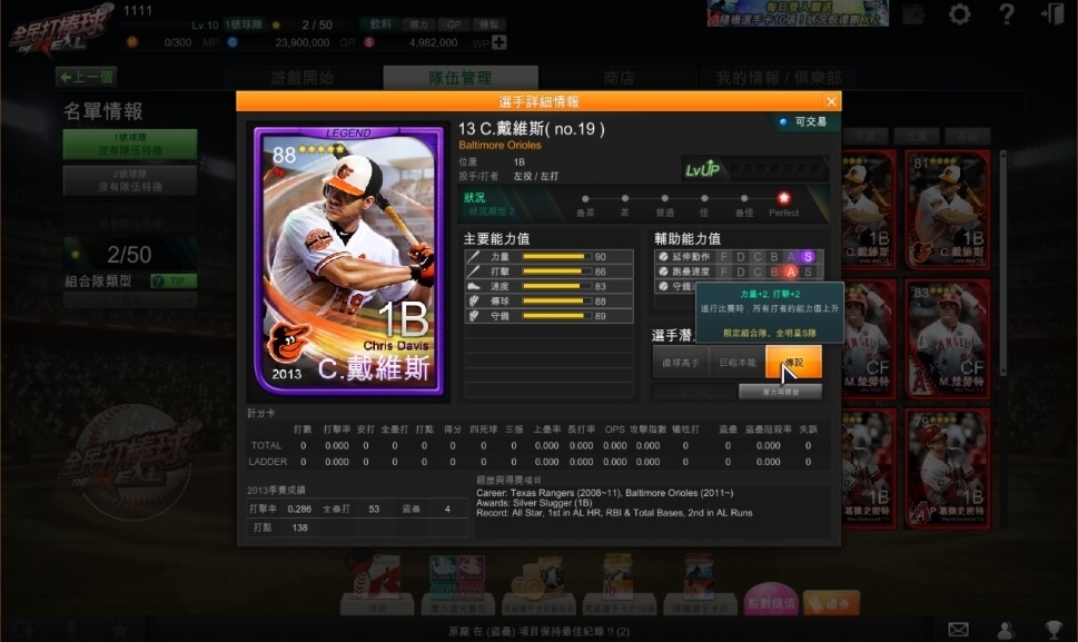 改版同步推出「13 MLB 球員潛力值」,其中投手方面,效力於洛杉磯道奇隊的「C. 科蕭」,2013 年共計出賽 33 場,取得 13 勝,防禦率達 1.83,優異的表現,榮獲國聯賽揚獎、防禦率王及三振王等的殊榮,當玩家使用【強力先發】潛力值後,上場後 6 局內的直球系列數值上升,有助於幫助球隊解決場上打者。而打者方面,目前效力於巴爾的摩金鶯隊的「C. 戴維斯」,表現十分傲人,13 年不僅繳出個人生第 100 支全壘打,更達成 50 全壘打 -40 二壘打的優秀紀錄,並奪下美聯打點王、全壘打王…等榮耀,當玩家使用【傳說】潛力值後,將使隊上所有的打者力量 +2、打擊 +2,是球隊中不可或缺的靈魂人物。