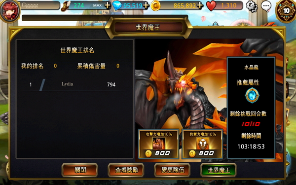 每場「世界魔王」玩家都有十次攻擊機會,而最後排名成績會以玩家的輸出總傷害值來計算,因此如何善用隊伍優勢創造出大量傷害數值,就靠玩家靈活的策略搭配。例如,每個魔王各自擁有不同的屬性差異,玩家可以根據屬性相剋機制來組合出完美的隊伍,贏得高額的水晶、金幣獎勵。