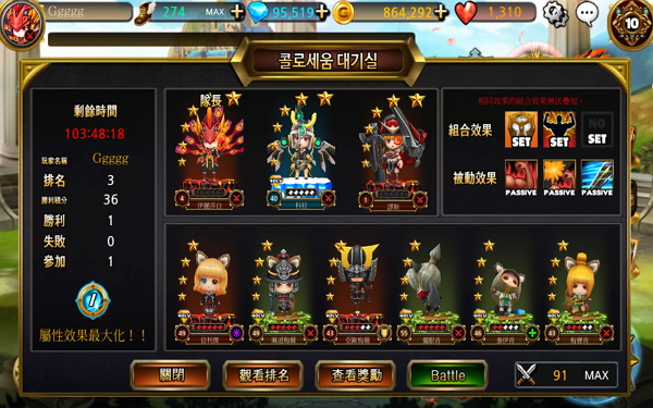 當對戰結束後,會依照玩家的勝負結果,給予勝利積分,競技場排名將以此積分為依據,愈高排名的玩家除了可以贏得豐富獎勵之外,更可以證明自己的實力地位!至於該怎麼做才能在競技場拿高積分呢?善用組隊BUFF提高隊伍屬性是相當重要的關鍵,在開戰前準備畫面,會提示玩家目前何種屬性的效果最大,妥善調整隊伍以發揮最佳戰力,才可以在對決中光榮勝出!