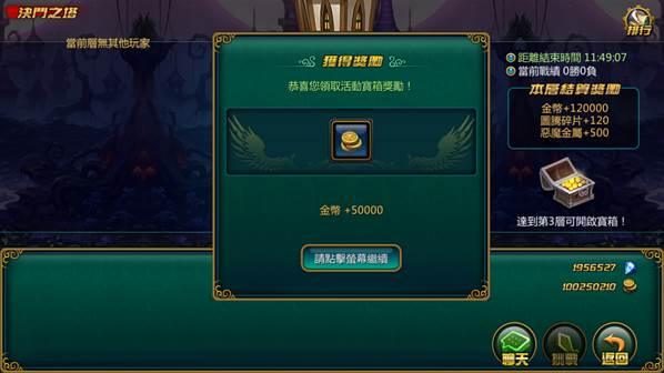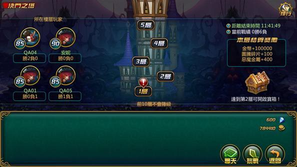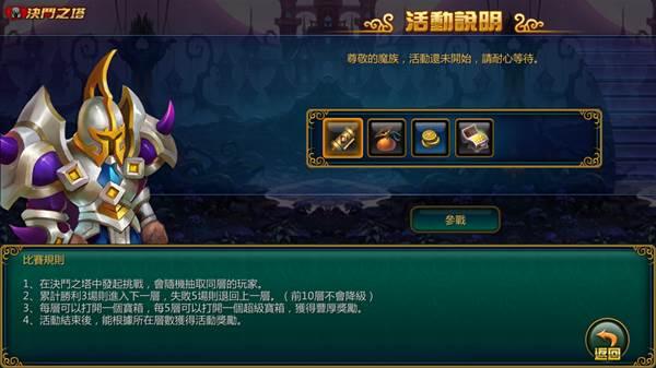 決鬥之塔為每週限時活動,不但能和其他伺服器的玩家切磋交流,並且還有豐厚的獎勵!玩家每爬一層都能打開一個寶箱,每 5 層還有一個超級寶箱,裡面的獎勵將超乎想像!活動結束後,根據所在層數玩家還能獲得金幣、圖騰碎片以及惡魔金屬獎勵!