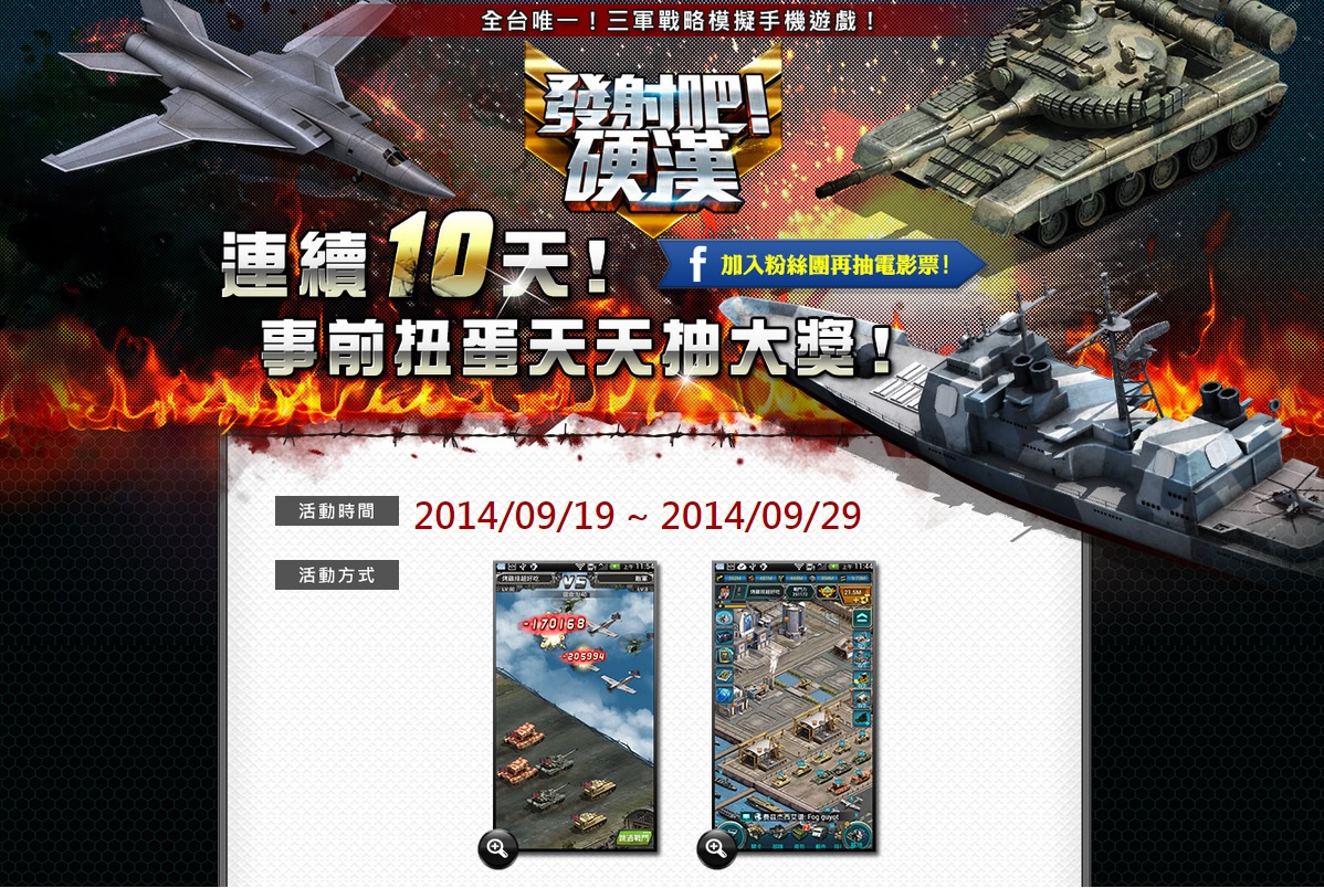 發射吧!硬漢》扭蛋抽大獎活動即將於 9 月 29 日截止,凡活動期間每天前往活動頁參與活動,即可獲贈寶箱一個,有機會獲得重型坦克、潛艇、戰鬥機及各種戰鬥資源,還能再抽鋼鐵人公仔、MyCard 點數,多項虛寶、好禮通通帶回家!硬漢玩家們,趕緊把握時間搶奪強力輾壓武器,感受侵略的戰鬥快感!