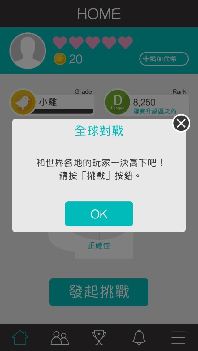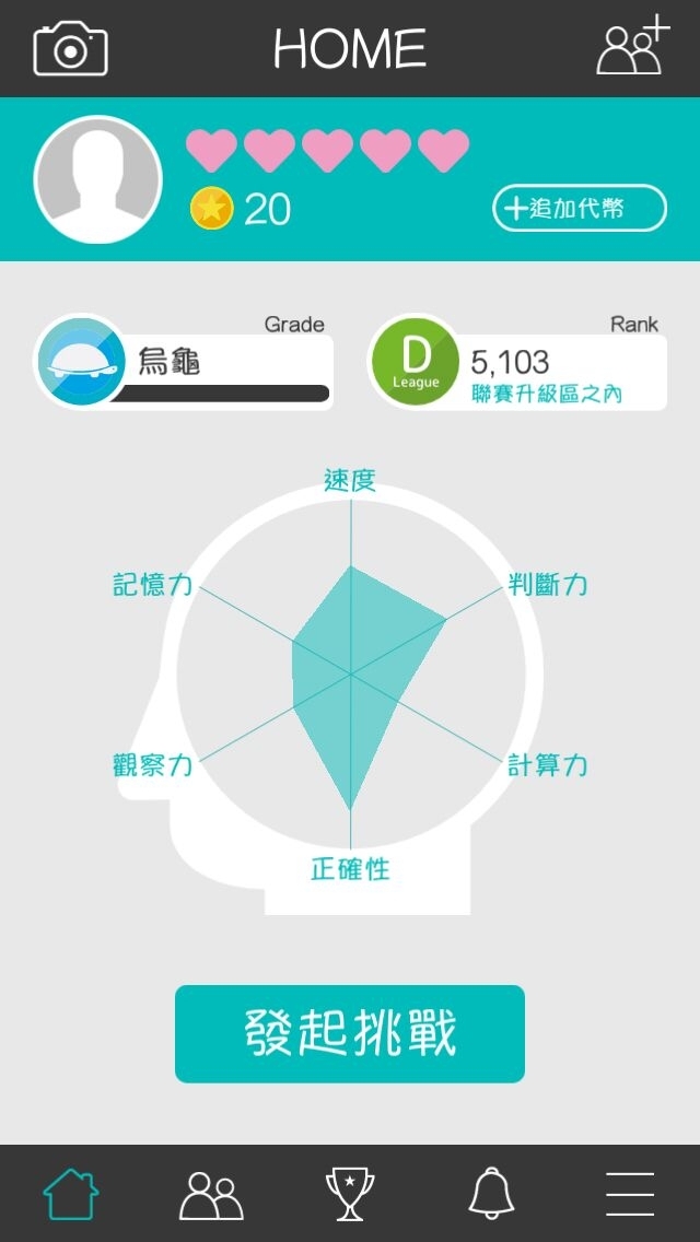 Brain Wars》的遊玩方式極為簡單明瞭,當玩家進入遊戲來到主頁面後,畫面正中央的圖表就代表玩家的目前的「腦力表現」。而畫面上方愛心則表示玩家目前的「行動力值」,也就是能遊玩遊戲的次數,「行動力」會隨著時間回復,只要在還有行動力的狀態下,點擊畫面下方、大大的「發起挑戰」按鈕,就可以直接開始遊戲,和其他玩家對戰了!