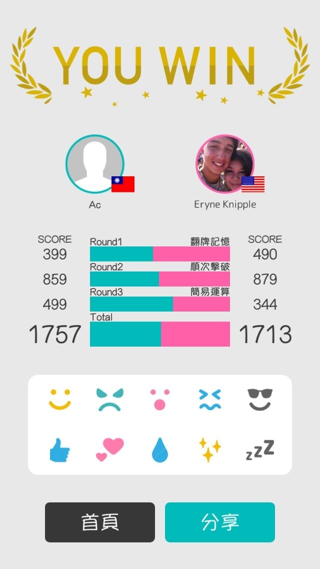 遊戲的對戰是以「隨機配對」方式來進行,所以當玩家按下發起對戰,有非常高的機會會碰上來自不同國家的對手,而當遊戲正式進入對戰之後,系統就會替兩位玩家自動選出數種小遊戲作為比賽項目,如按照數字大小來依次點擊方塊的「升序降序」、考驗玩家對顏色的敏感度和反應力的「顏色陷阱」等等,進行每回合約 15 秒的比賽。一次完整的對戰總共會有三回合,比賽結束之後,玩家就能看到總分的統計,揭曉雙方孰勝孰負,同時看到自己的「腦力」的變化囉!