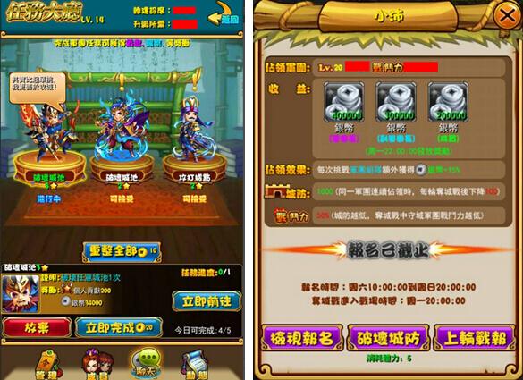 當玩家在「軍團任務」中領取到修復和破壞城池的軍令時,城池爭奪界面出現「破壞城防 / 城池修復」的功能,接受到相關軍團任務的軍團成員,可以在各個城池修復軍團佔領地的城防值,或是率兵破壞其他軍團所佔領的城池。事不宜遲,各主公們火速領軍攻佔屬於你的領土奪取鉅額獎勵!