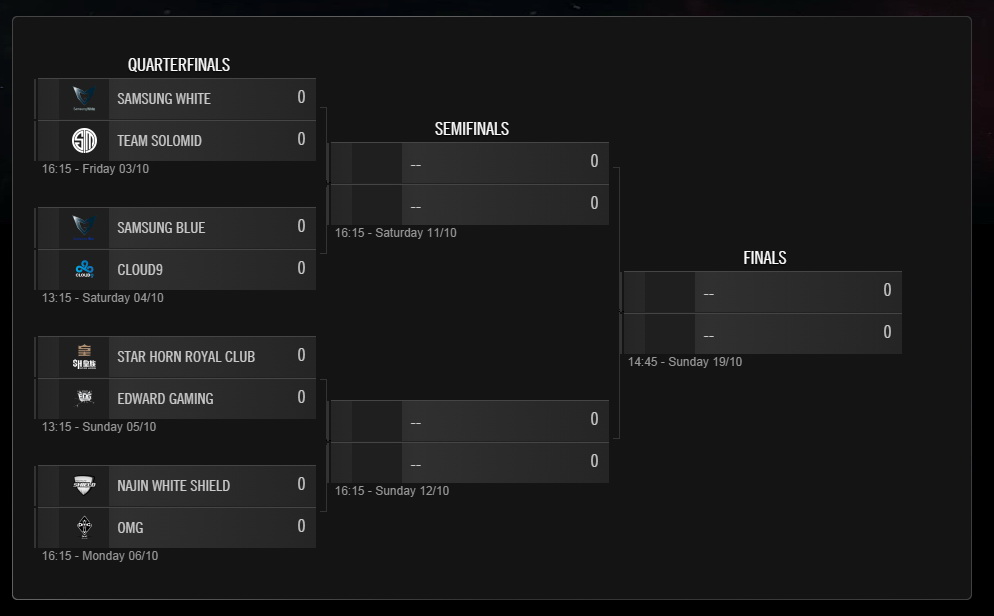 》2014 世界大賽 8 強賽採 Bo5 賽制,比賽即將於 10 月 3 日星期五在韓國釜山登場。比賽為期 4 天,而首戰是由 Samsun White(SSW)對上 Team Solomid(TSM)。